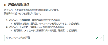 キャンペーン事前テストでは、(1)実施内容の評価をする「キャンペーン内容評価」と(2)伝達方法を評価する「キャンペーンメッセージ評価」、広告クリエイティブ事前テストでは(1)ブランド構築を目的とする「ブランディング重視視点」と(2)行動喚起を目的とする「レスポンス重視視点」と、目的に応じた評価視点を選択可能です。さらに、一部の指標はテキスト入力で設定することもでき、より柔軟な評価設計を実現します。