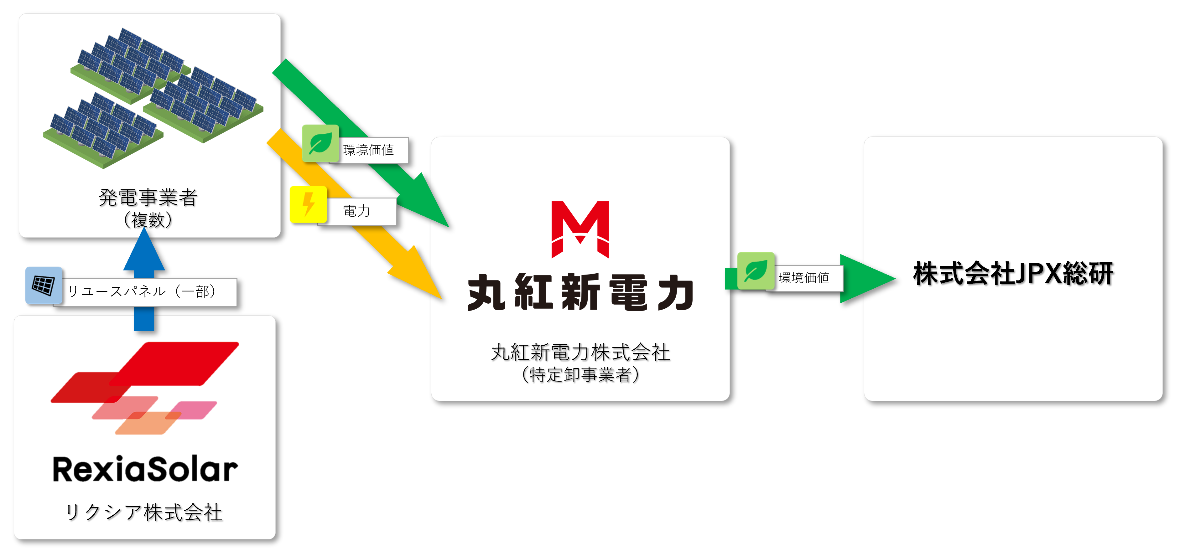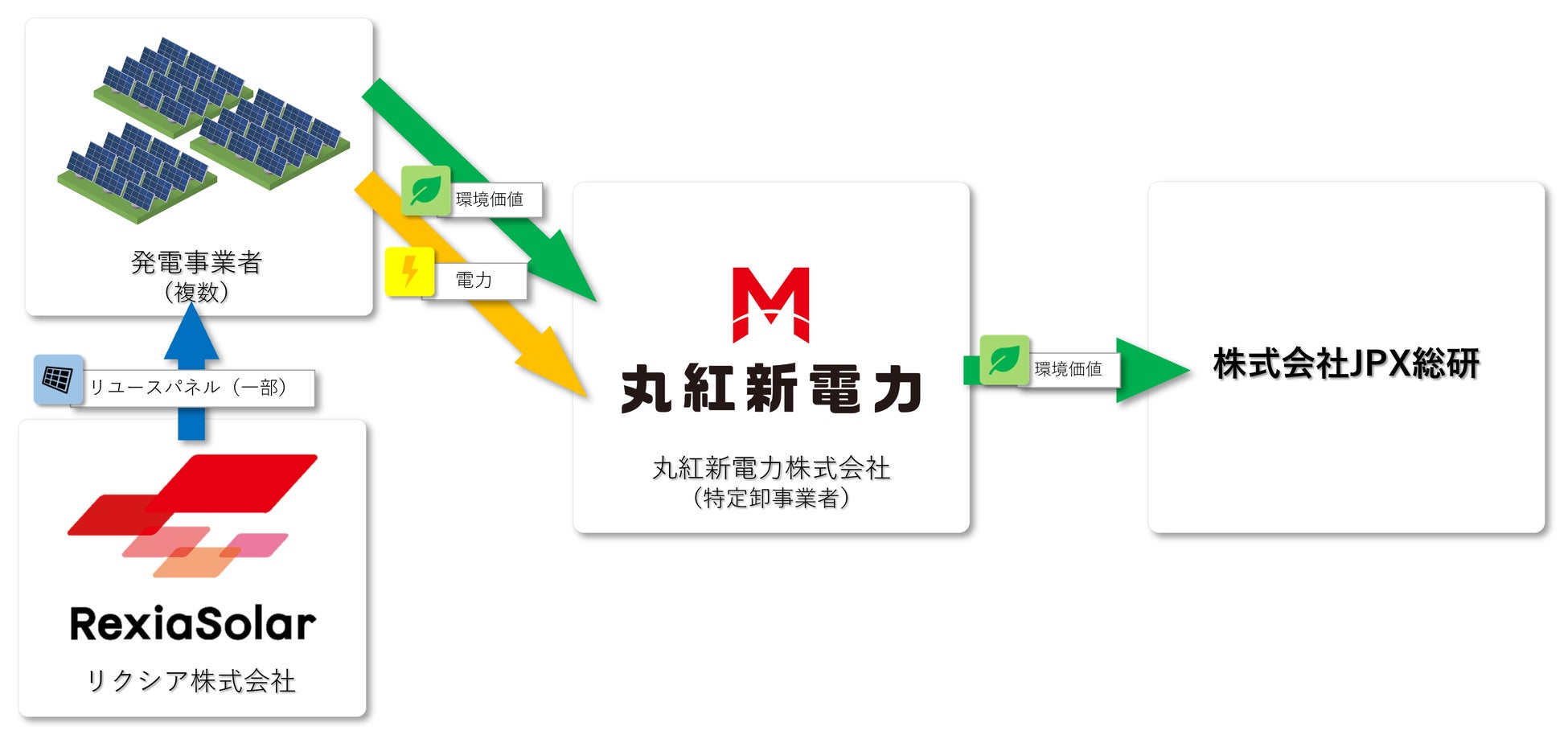 一部のパネルについては、丸紅株式会社の関連会社であるリクシア株式会社(代表取締役:若山 美奈子、本社:東京都千代田区、以下「リクシア」)が供給しており、リユースパネルを活用した第三者所有型のバーチャルPPAとしては、国内初(リクシア調べ)の取り組みとなります。