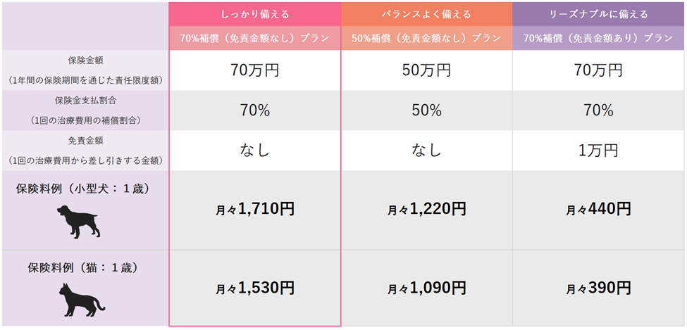 ペットの病気やケガに対して、ご契約商品に応じた治療費用(通院・入院・手術)の一定割合(70%・50%)をお支払いします。