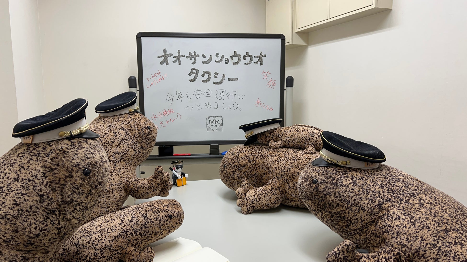 今年もMKタクシー様にご協力いただき「オオサンショウウオタクシー」が町を走ること、大変うれしく思います。期間限定で助手席に乗るオオサンショウウオぬいぐるみをぜひ多くのお客さま、そして町の皆さまにご覧いただき、お楽しみいただければと思います。
