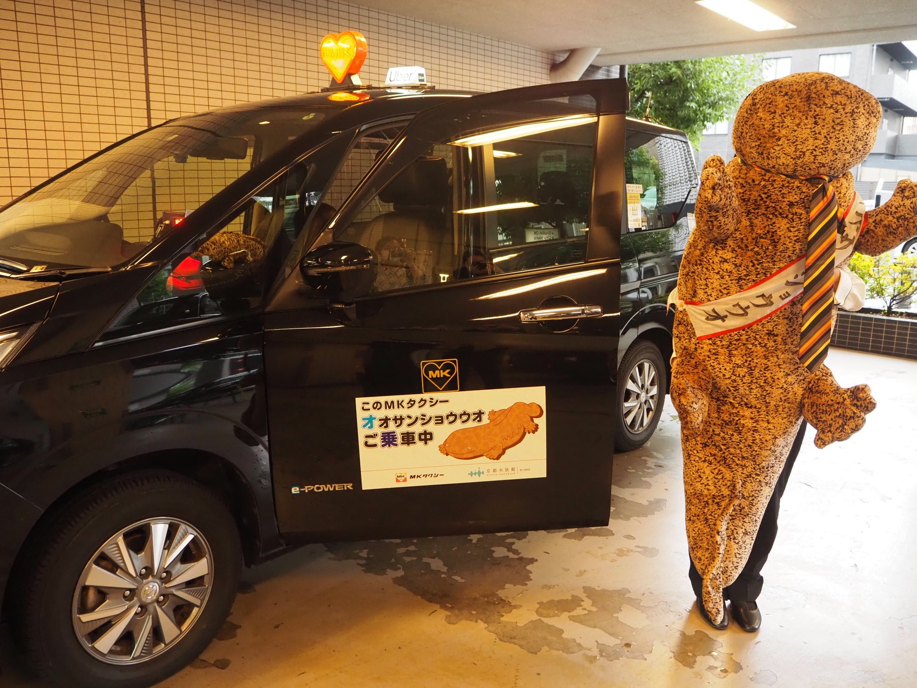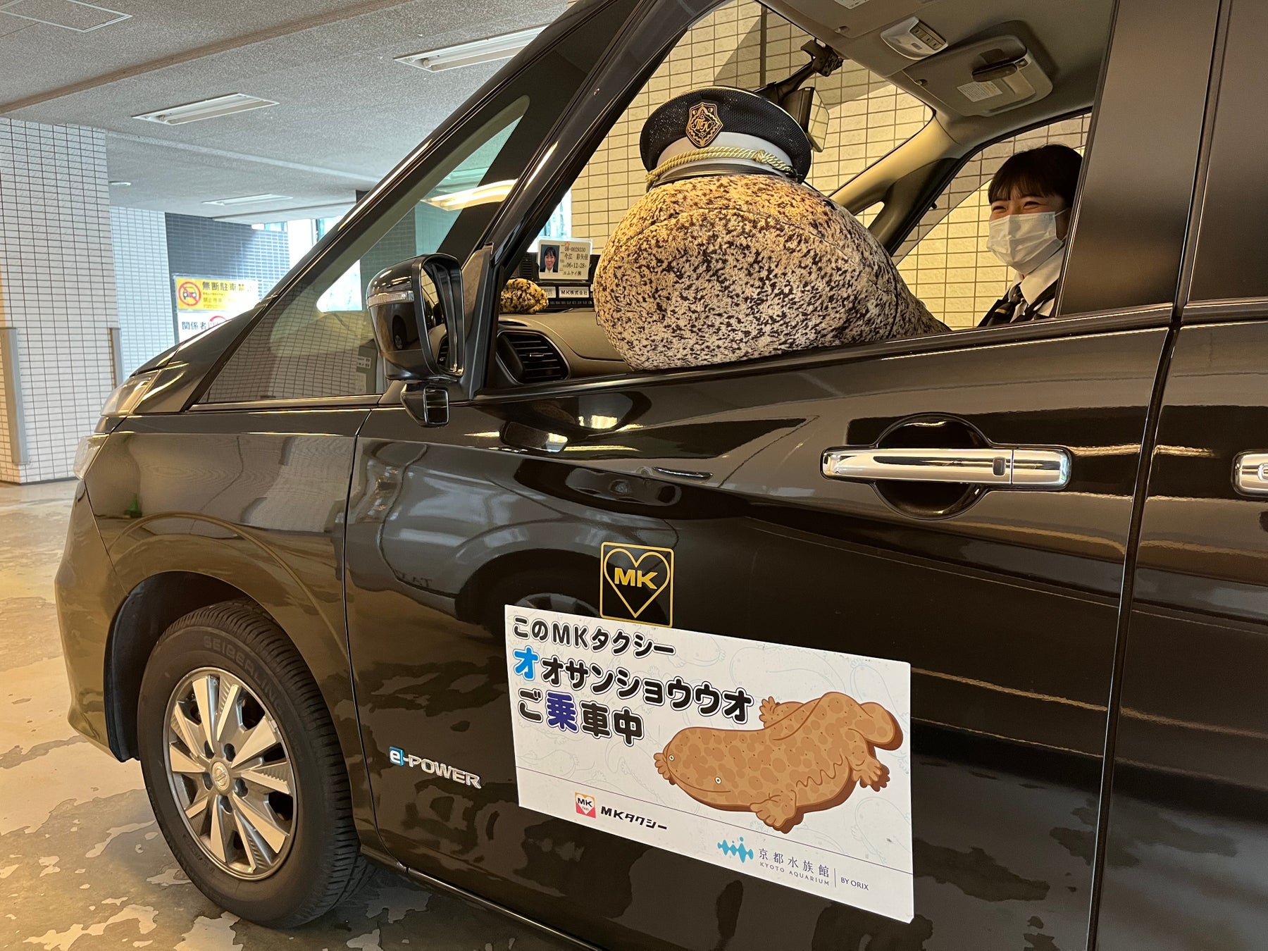 オオサンショウウオタクシーは、155cmのオオサンショウウオのぬいぐるみがタクシーの助手席に乗車し、ドライバーと一緒に運行する京都水族館とのコラボタクシーです。
