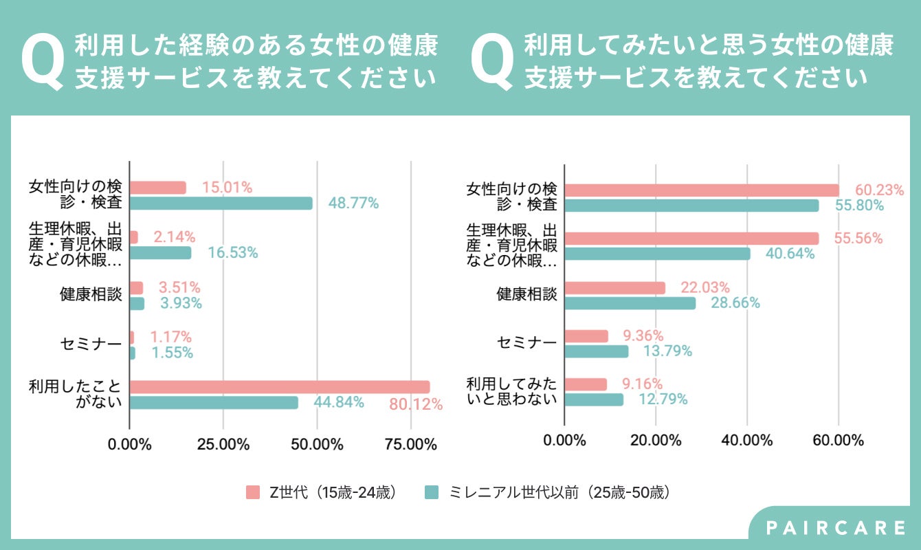 続いて、「あなたが利用してみたいと思う女性の健康支援サービスを教えてください」という質問をすると最も多かった回答が、Z世代・ミレニアル世代以前ともに「女性向けの検診・検査」でした。次いで「生理休暇、出産・育児休暇などの休暇制度」、「健康相談」、「セミナー」でした。