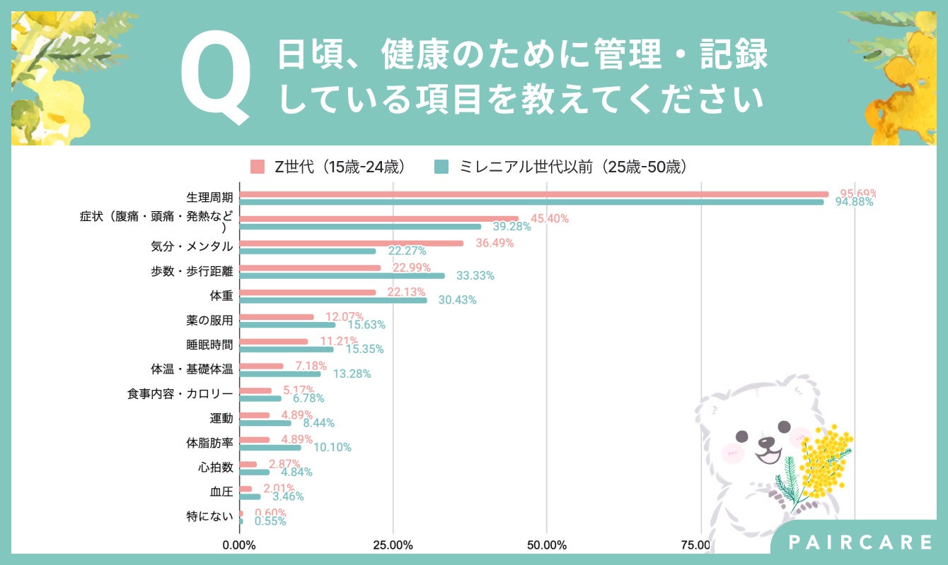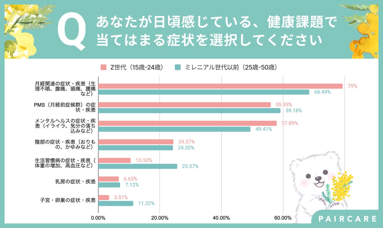 次いで「PMS(月経前症候群)の症状・疾患」約60%、「メンタルヘルスの症状・疾患(イライラ、気分の落ち込みなど)」約50%、「陰部の症状・疾患(おりもの、かゆみなど)」24%など月経やメンタルヘルス等の女性特有の健康課題が多く、Z世代の約80%、ミレニアル世代以前の約70%が月経関連の健康課題を抱えている結果となりました。