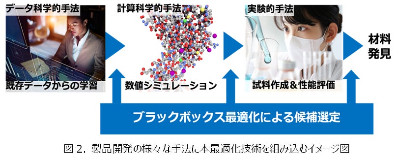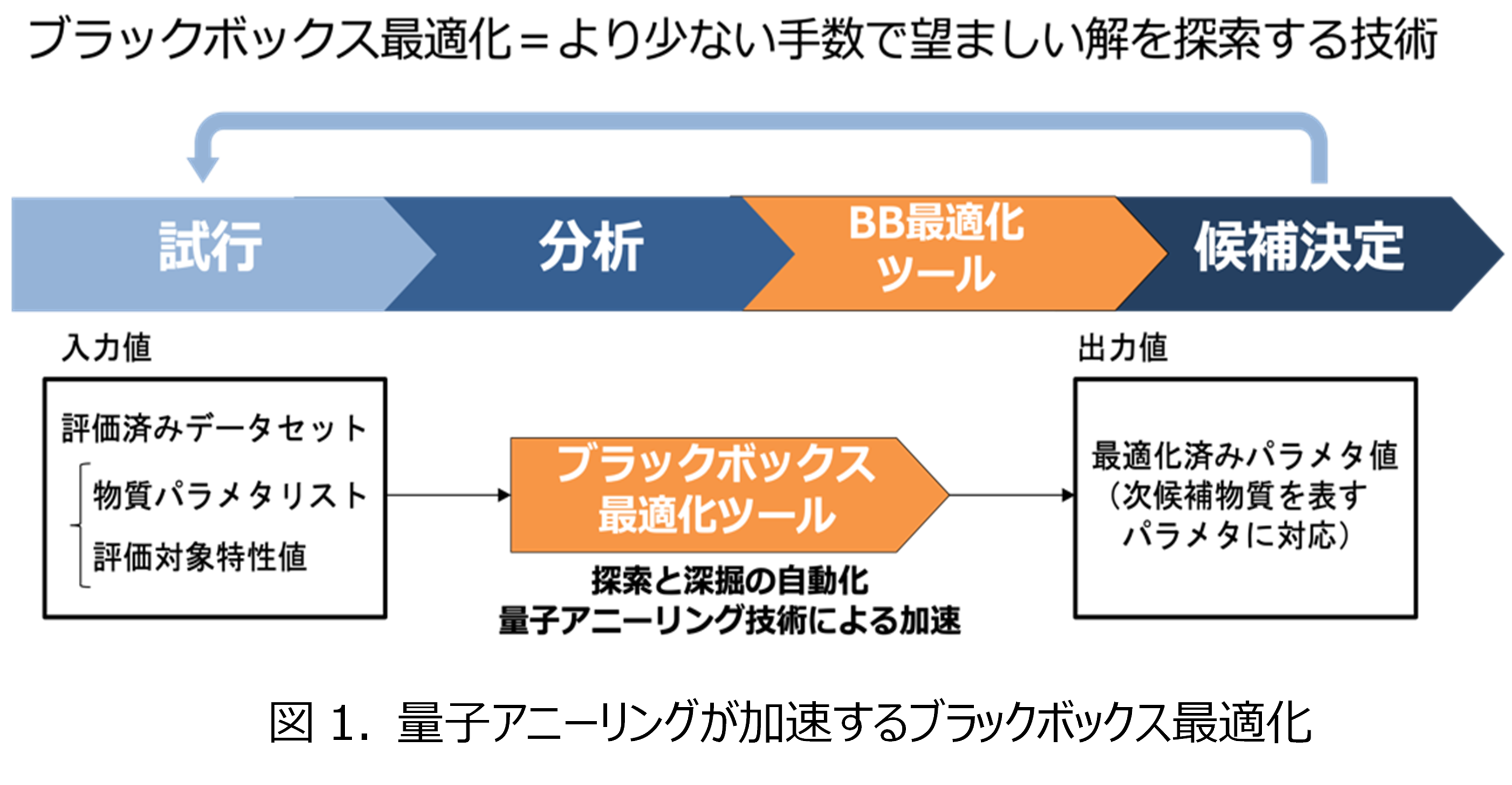 通常、製品開発の場面では、最適な開発品を生み出すために試作と評価を繰り返す必要があり、時間もコストもかかっています。三井化学とシグマアイは、活用できるデータが少ない状況でもより少ない回数で希望する候補材料を選定する方法として、量子アニーリングを用いたブラックボックス最適化技術(図1)に注目しました。