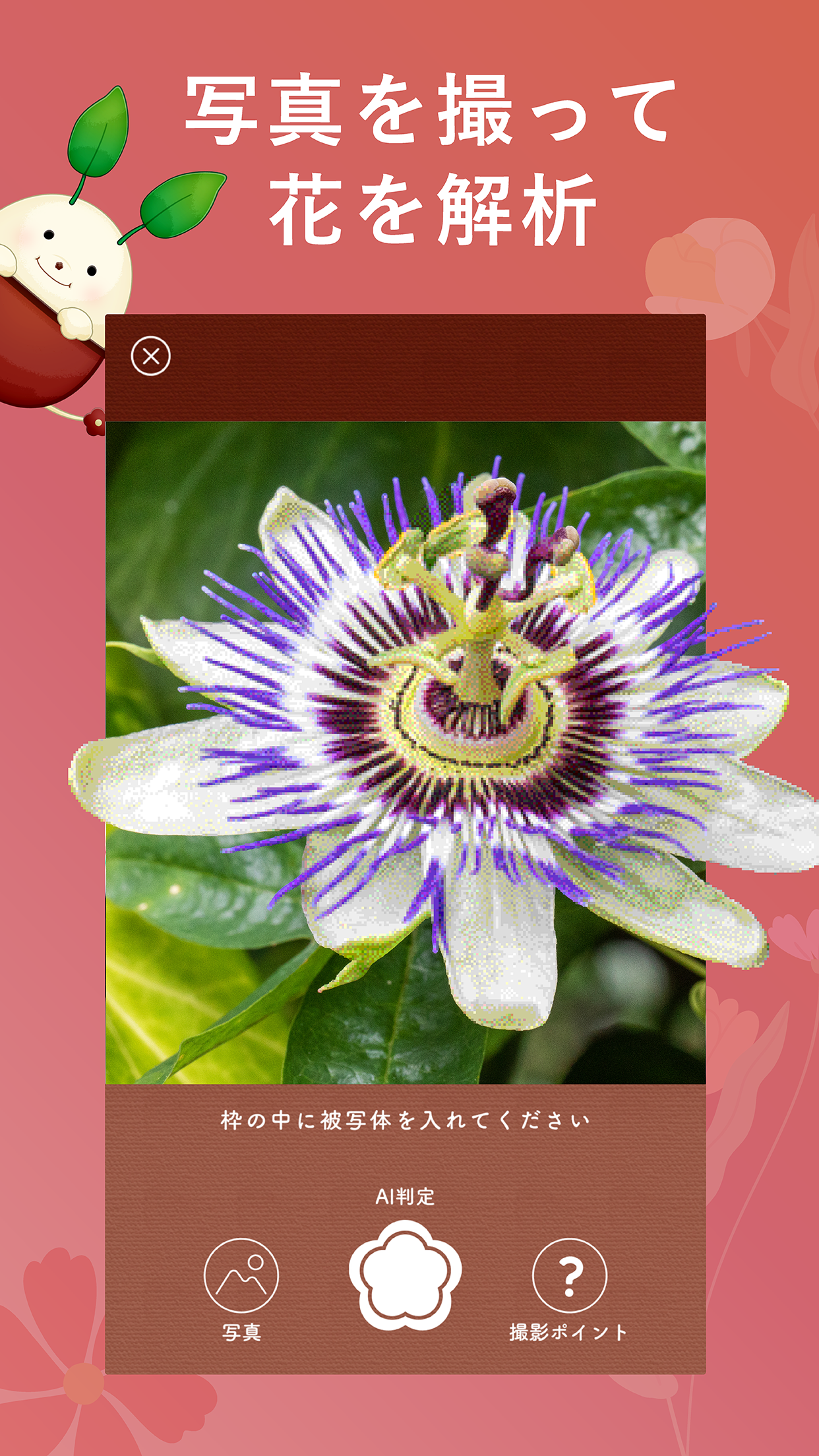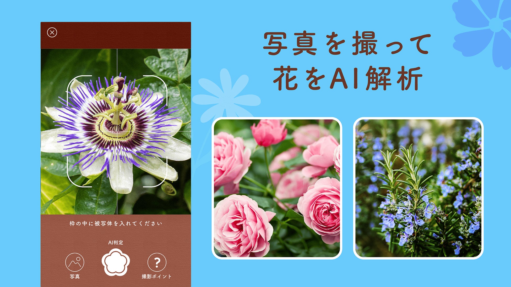 アプリ内より花の撮影をすると、人工知能AIが「自動解析&識別」を行って、どのような花なのかをいつでも判定し調べる事ができます。