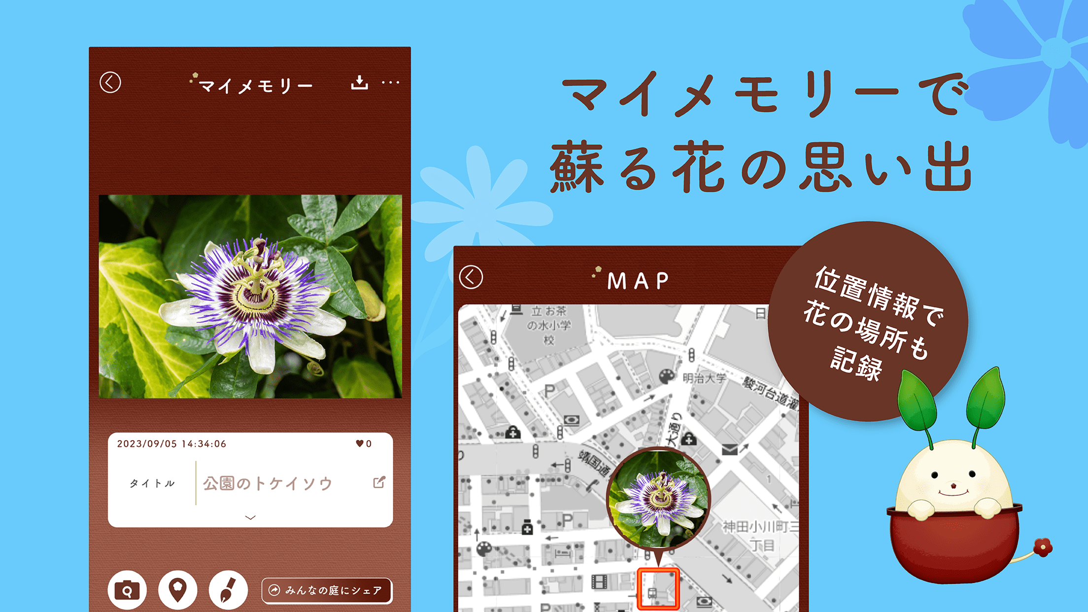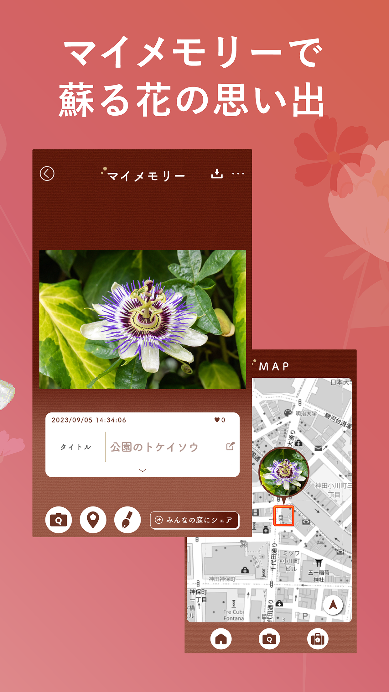 地図に写真をマッピング(ピンうち)する事も出来るため、ガーデニングで育てた花や、散歩で見かけた綺麗な花はもちろん、旅行やお花見など、ちょっと足を伸ばした外出時の思い出の振返りにも活用できます。
