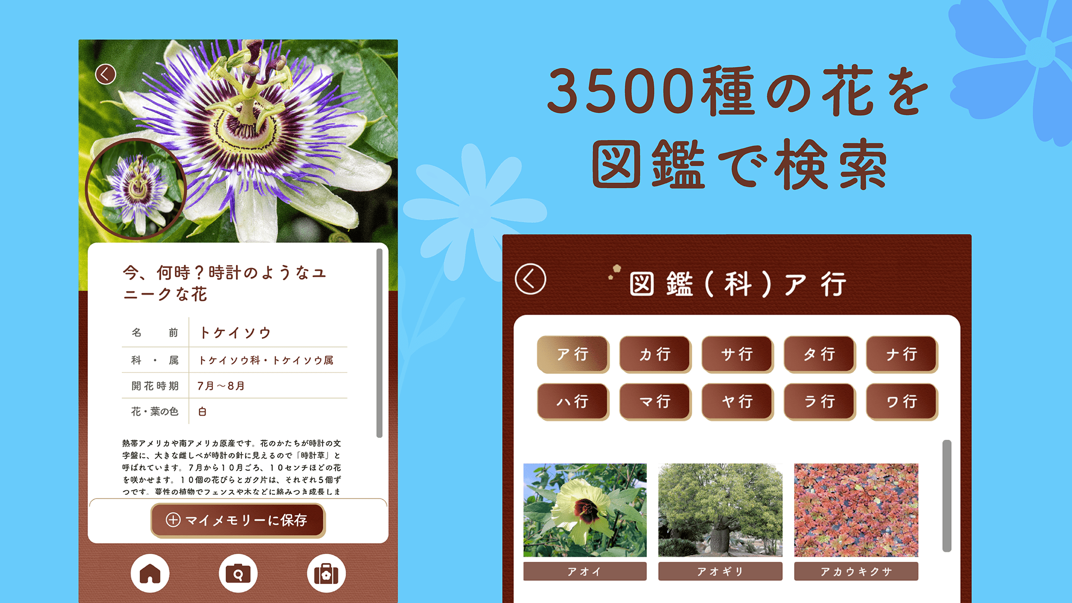 散歩などのお出かけの際に気になった花や、電波が届かない登山、キャンプなどで撮影した花の写真もスマートフォンのアルバムに保存しておくことで、後から解析&識別することも可能です。