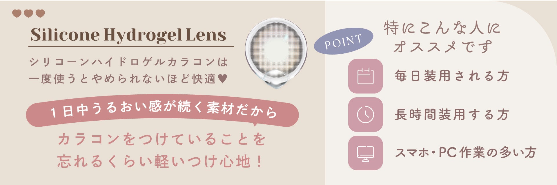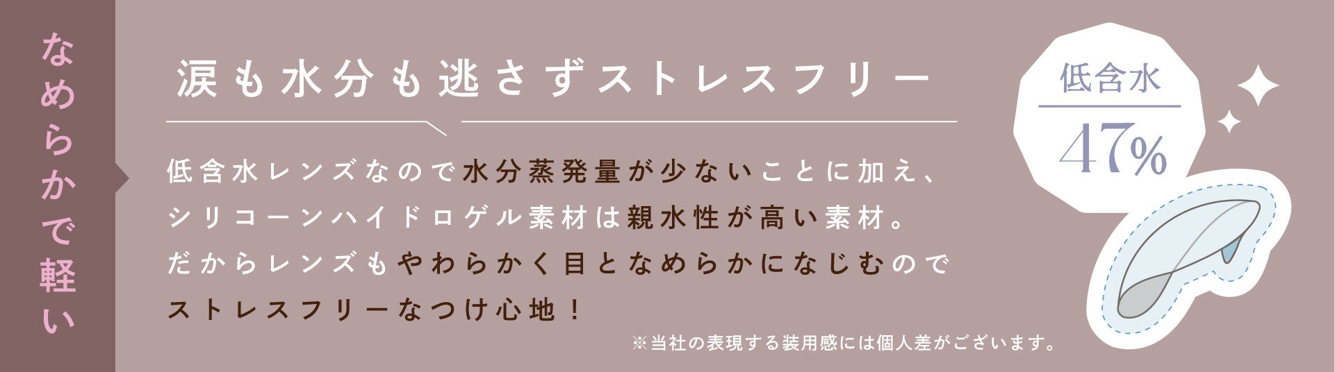 レンズと水分が馴染みやすく親水性に優れているためレンズも柔らかく、目となじみやすいので異物感や乾燥感といった装用時のストレスを軽減します。