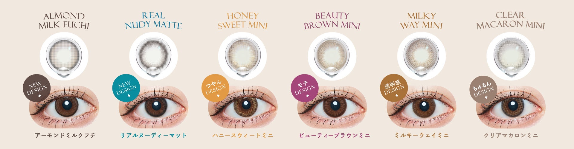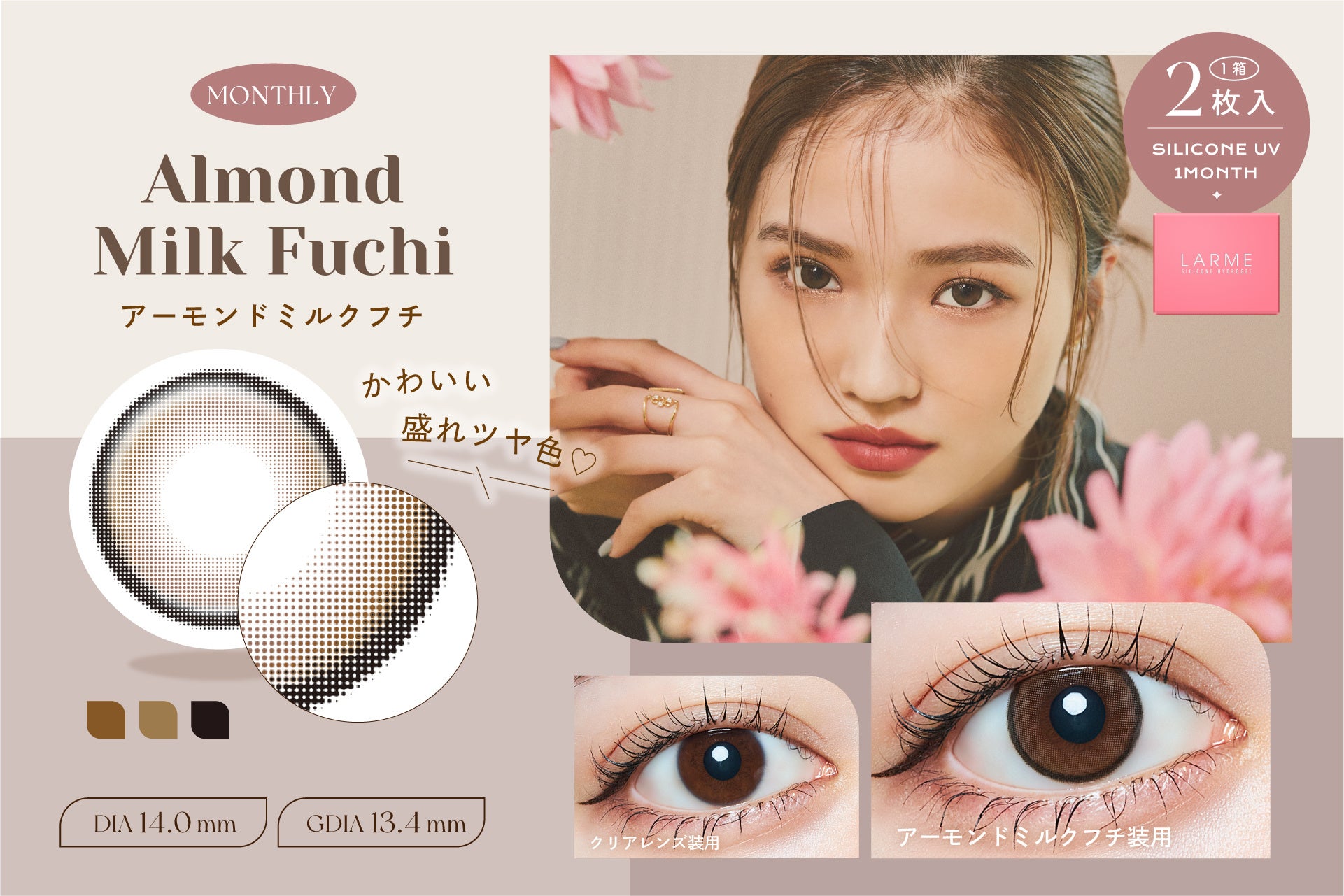 1month限定カラーのアーモンドミルクフチは、ちょうどいい細フチと瞳を潤ったように見せる今までにない水光グラデーションデザイン。ミルキーな色合いとくっきり細フチのおかげで可愛いアカ抜け瞳に。