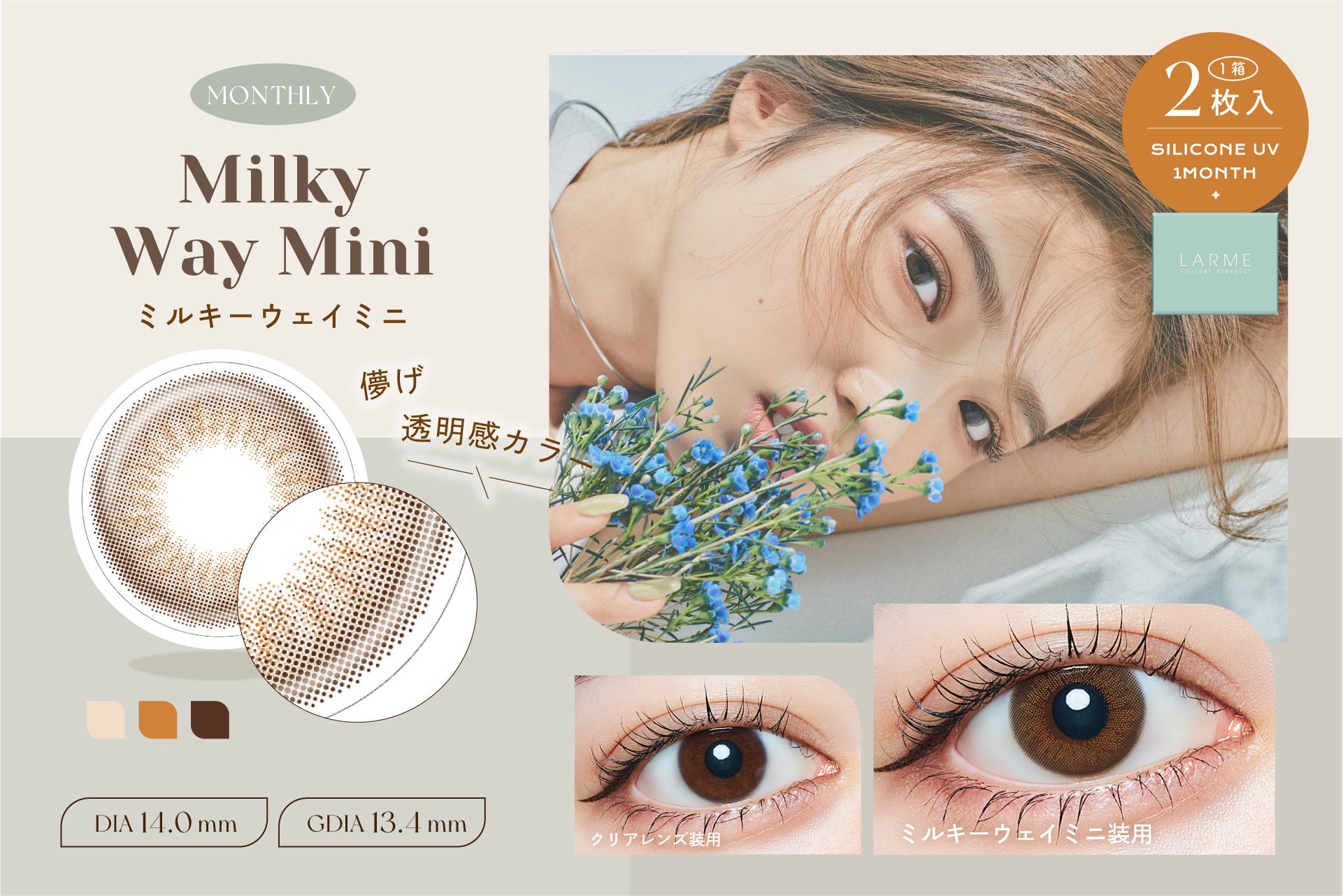 メルティシリーズで人気のデザインをマンスリー化。ミルキーウェイミニは儚げに見せるくすみベージュをベースとした、透明感と立体感のある瞳になじむ色合いで大人気。ほど良く盛れて透明感も出したい方にオススメです。