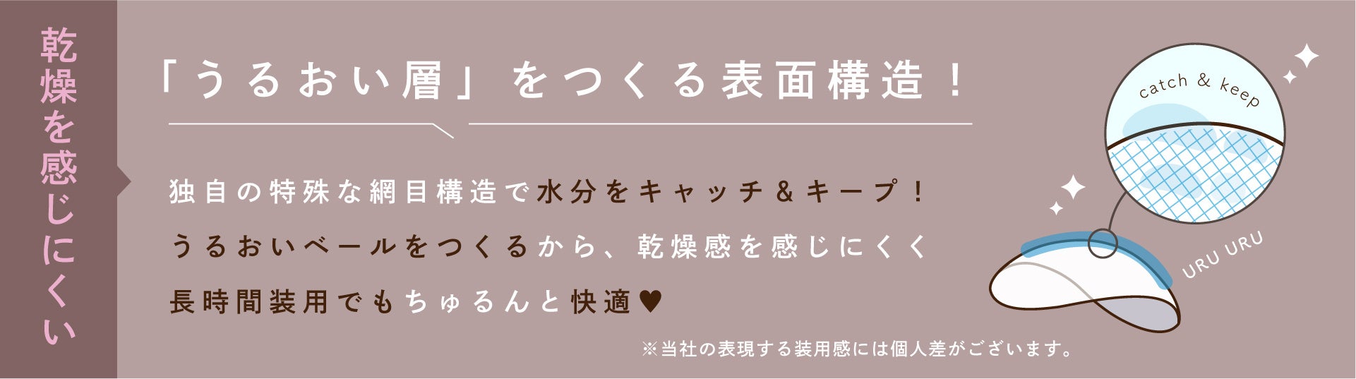 独自の特殊な網目構造、モイストキャッチテックTMを採用。キャッチした水分を留まらせ、レンズ表面に潤いをキープするので、乾燥感を軽減します。