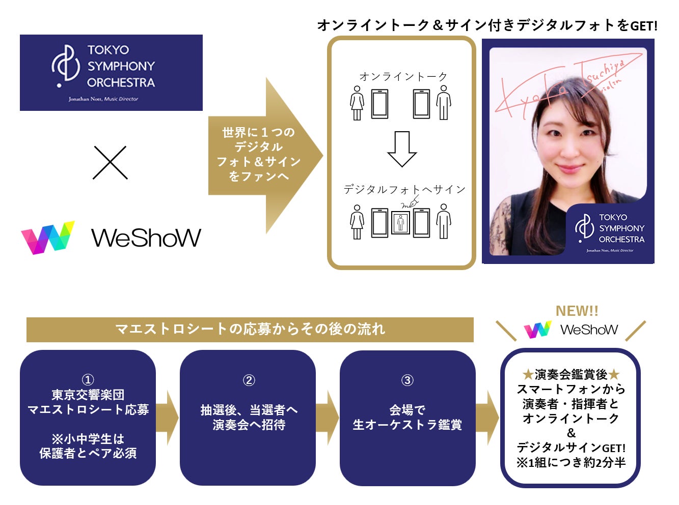 この度、東京交響楽団とWeShoWは共同で、小学生・中学生・高校生(19歳未満全ての青年)を対象とした奏会招待&交流企画「マエストロシート」において、双方向型ライブ配信技術を活用し、オンライントークとオリジナルサイン付きデジタルフォトをプレゼントするかたちにリニューアルいたしました。