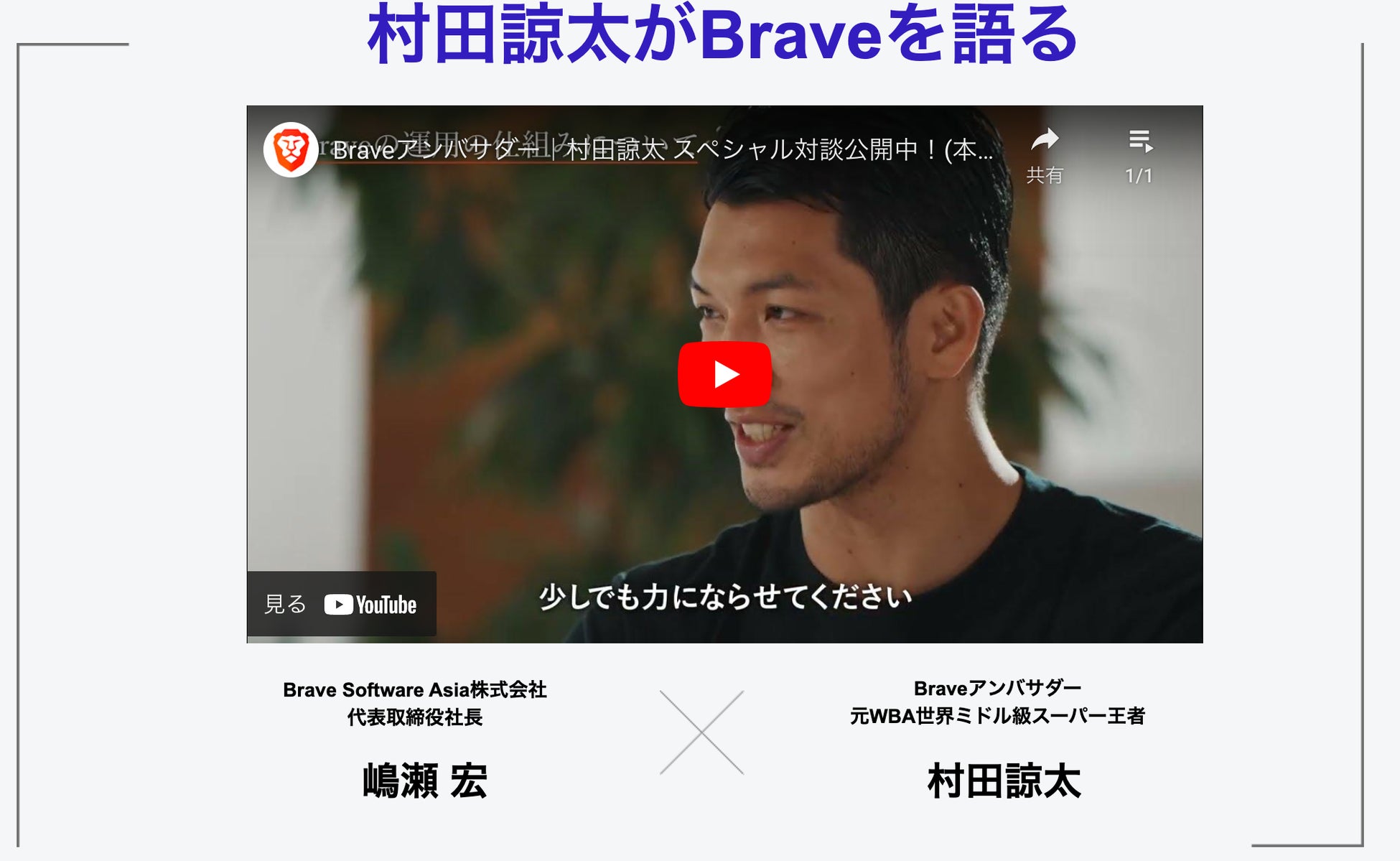 2012年のロンドンオリンピックで48年ぶりとなる金メダル。その後プロに転向し、数々の世界の強豪と戦いチャンピオンに。日本人で唯一のオリンピックでの金メダルとプロの世界王者獲得の偉業を達成。それも世界の層の厚さから日本人の体格では不可能と言われたミドル級での快挙。日本人に重量級は難しい。そんなイメージを打ち破った村田選手のように、Braveは崩すことが困難とされるBig Tech企業の独壇場である検索・ブラウザ市場において、ユーザーを第一に考え、Webを修復するというミッションのもとBraveに(果敢に)革新的な機能を提供してまいります。