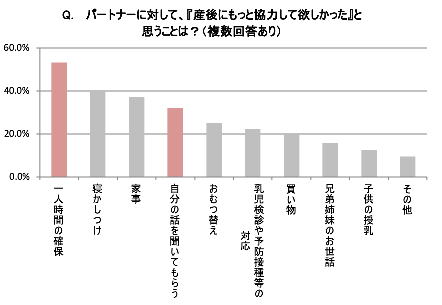 ▼産後に協力してほしかったことの5割は「一人時間の確保」