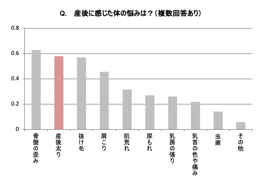 一方「産後に感じた体の悩み」については、約6割が「産後太り」と回答。産後太りに悩んでいるママが多いことが伺えました。