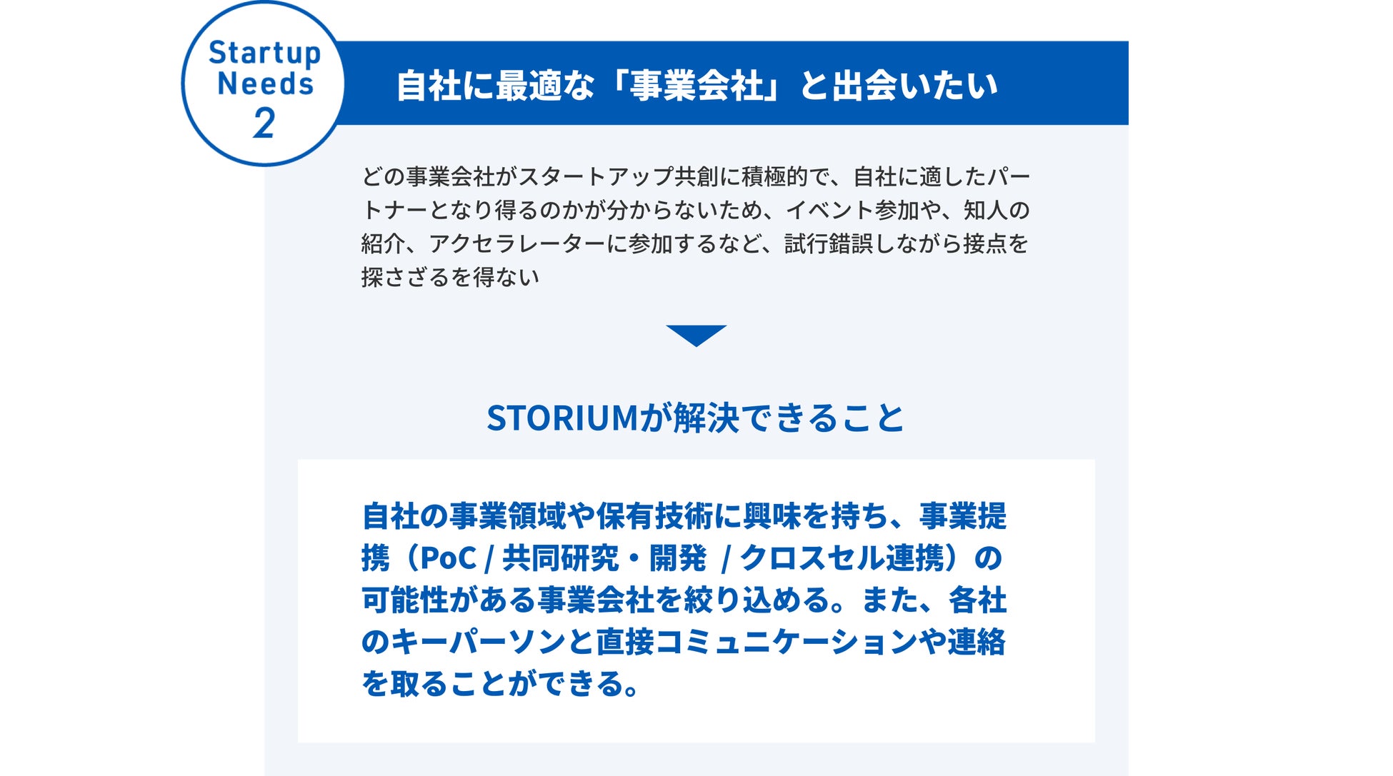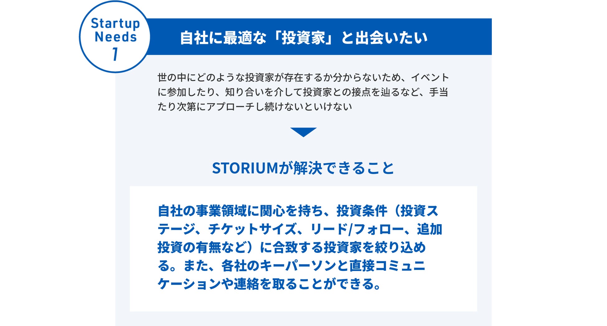 STORIUMは、次世代イノベーションを牽引するスタートアップ、投資家、企業のキーパーソンに調和と共創の機会を提供する「新産業創造プラットフォーム」です。企業間の情報非対称性を解消し、安心かつ最適なオンライン環境を実現。以下の3つの機能とサポートを通じて、スタートアップが企業価値を向上させるための良質な投資家や事業会社との出会いを強力にアシストします。