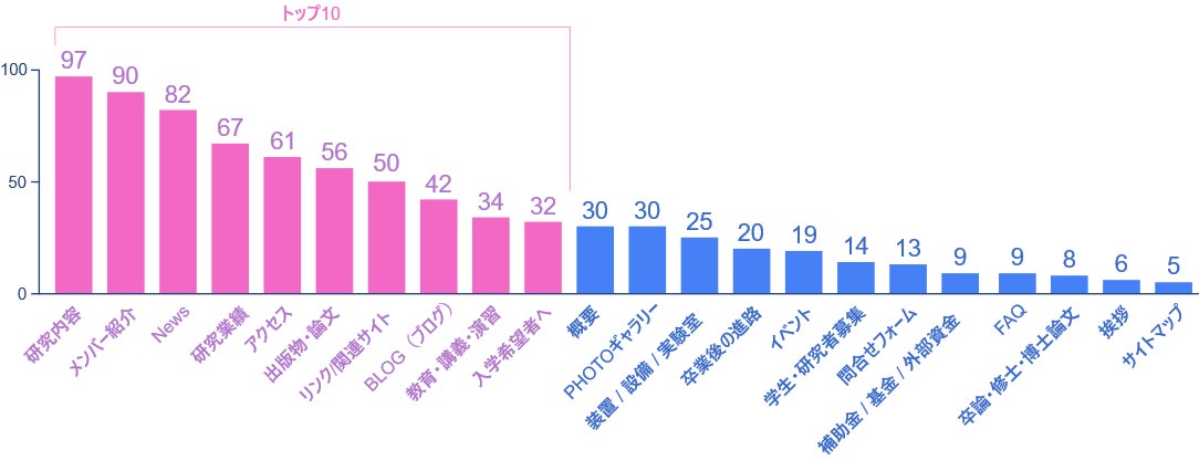 調査結果によれば、研究室Webサイトにおける最も定番のコンテンツは「研究内容」(97%)で、ほぼすべてのサイトが何らかの形で研究領域やテーマを紹介していました。次いで「メンバー紹介」(90%)、「News(お知らせ)」(82%)、「研究業績」(67%)、「アクセス」(61%)などが上位を占めています。