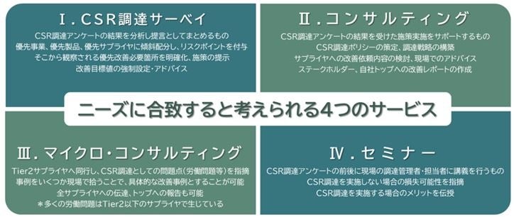 弊社JMARのCSR調達/サステナブル調達支援プログラムは、坂口孝則氏監修のもと、“結果にコミットする支援”というコンセプトの下、①見える化+解釈と目標設定、➁個別コンサルティングの提供、③マイクロコンサル提供、④調達部員向けセミナーという実務展開につながるサービスを一気通貫でご支援することが可能であるという点が特徴・強みといえます。