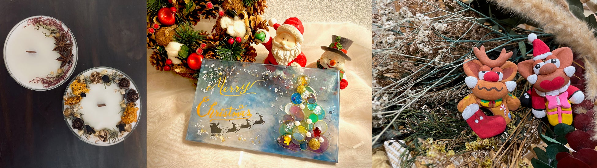 「オキナワ ハナサキマルシェ」では、クリスマスを彩るワークショップを開催いたします。アロマキャンドルやクリスマスボード、シーサー絵付け体験など、様々な作品づくりを体験することができます。旅先の思い出作りを手作りで!大人も子どもも夢中になれます♪