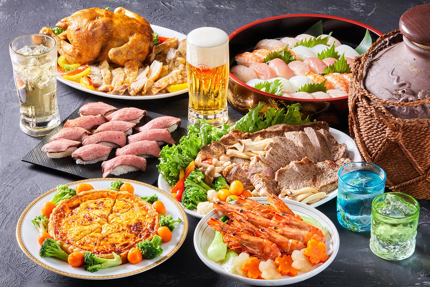 ロイヤルビューホテル美ら海では、12月17日〜1月2日の間、ディナー付きリブランド一周年記念&クリスマス宿泊プランを販売いたします。丸鶏ローストチキン、ローストビーフ寿司、ステーキの他、12月24日〜12月25日はクリスマス限定でホワイトケーキやブッシュドノエルのサービスも。お好きなものをお好きなだけお楽しみいただけます。大切な方やご家族と一緒にクリスマスディナーをご堪能ください。