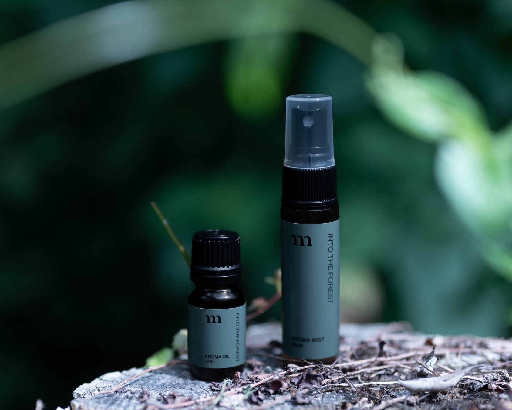 muracoの「INTO THE FOREST」の香りは、100%天然のエッセンシャルオイルのみをブレンドした、高野槇や吉野檜などのウッドの香りを楽しめるブレンドです。深い森の中へ誘われるような、爽やかさと荘厳さが調和した深みのある香りを表現しています。アイテムは、ディフューザーなどで香りを広げて楽しめるエッセンシャルオイルと、場所を選ばず霧状にして使えるエアミストの2種類をラインアップしました。