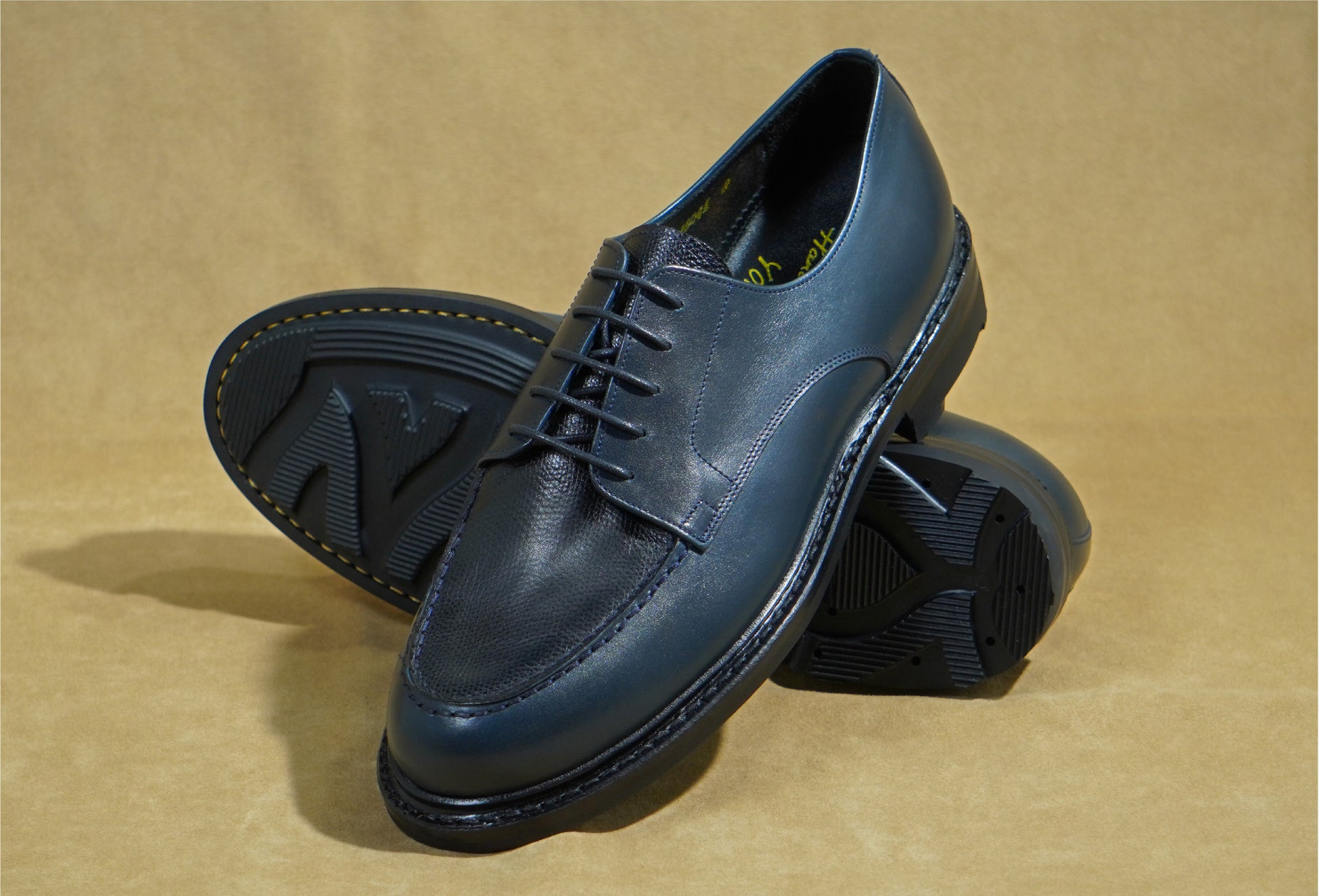 「港町横浜×Jalan Sriwijaya」をテーマに、それぞれのイメージカラーでもあるネイビーを配した特別モデル。ヴァンプに型押し加工を施したブラックグレインレザーを採用することで、上品さも兼ね備えた大人カジュアルな雰囲気を演出します。