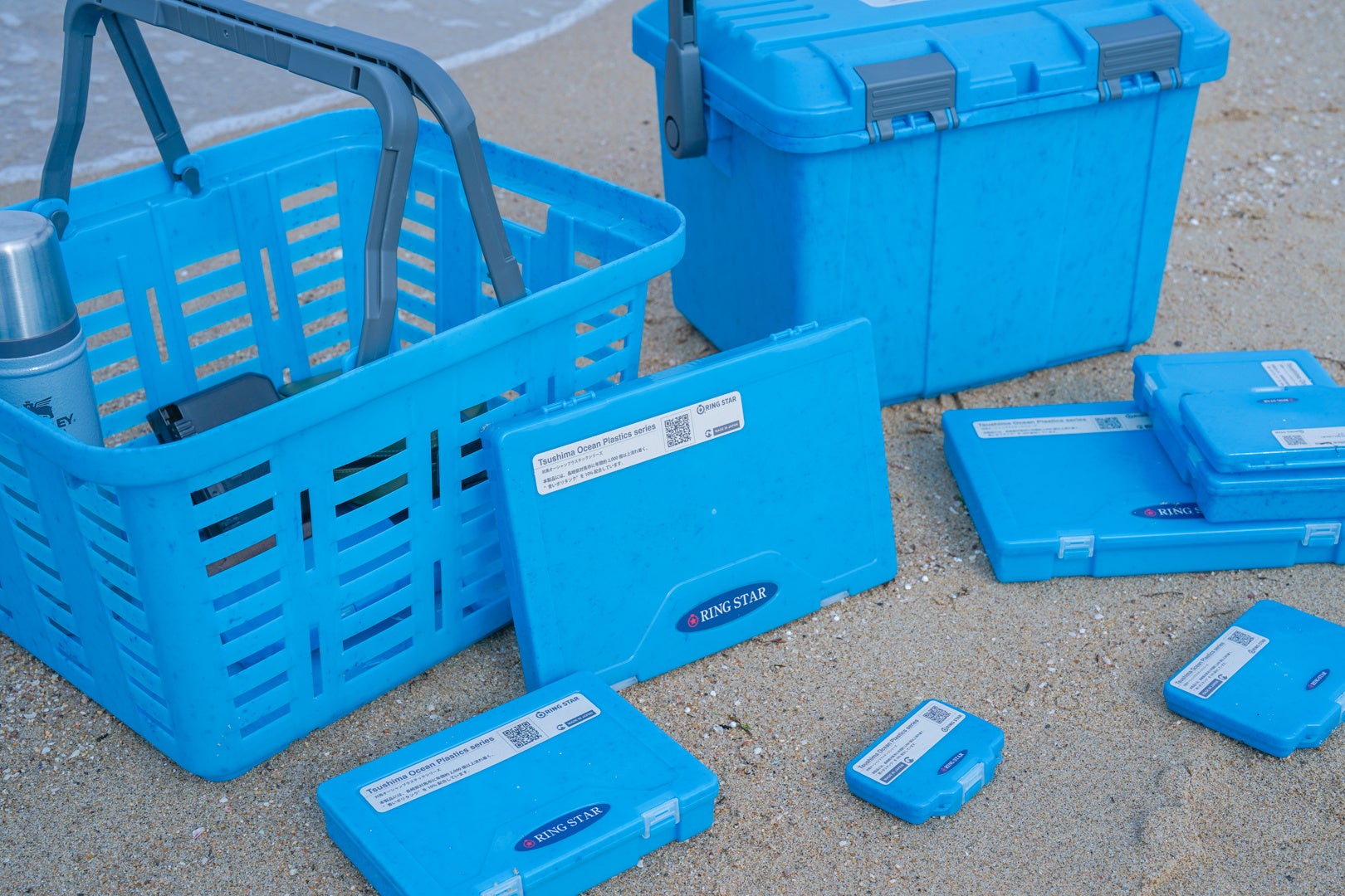 株式会社リングスターでは、2023年4月より、オーシャンプラスチック(中でも、年間約2000〜3000個以上が漂着するというポリエチレン製の“青いポリタンク”)を10%配合した「対馬オーシャンプラスチックバスケット」「対馬オーシャンプラスチックボックス」を販売しています。