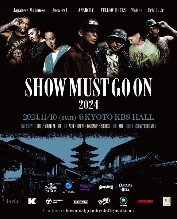 HIPHOP フェス「SHOW MUST GO ON」が 2024 年 11 月 10 日、京都 KBS ホールにて 初開催されます! ANARCHY をはじめ、京都の若手や各地で活躍する RAPPER、DJ、DANCER たちをスペ シャルゲストとして迎え、音楽を通じて来場者にエネルギーとインスピレーションを与え ることを目指しています。 特に若い世代がこのライブを体感することで、新たな創造力を引き出し、成長の糧となる ような場にしたいと考えています。 また、会場内外では物販スペースや飲食ブースを設置し、音楽ファンのみならず、家族連 れや子供たちも楽しめるお祭りのような雰囲気を演出! フェスを通じて、京都の街の活性化にも寄与することを目指しています。 将来的には、HIPHOP に限らず、ストリートカルチャー全般(RAP、DANCE、DJ、 GRAFFITI、SKATE、BMX、BASKETBALL、DoubleDutch など)を体験できる総合フェ スへと成長させ、全国規模での発信を目指しています。 全国から多くの皆様にご来場いただき、音楽やカルチャーを通じて京都の魅力を再発見し ていただければ幸いです。ぜひこの機会に「SHOW MUST GO ON 2024」でしか体感で きない熱いパフォーマンスをお楽しみください。皆様のご参加を心よりお待ちしております!