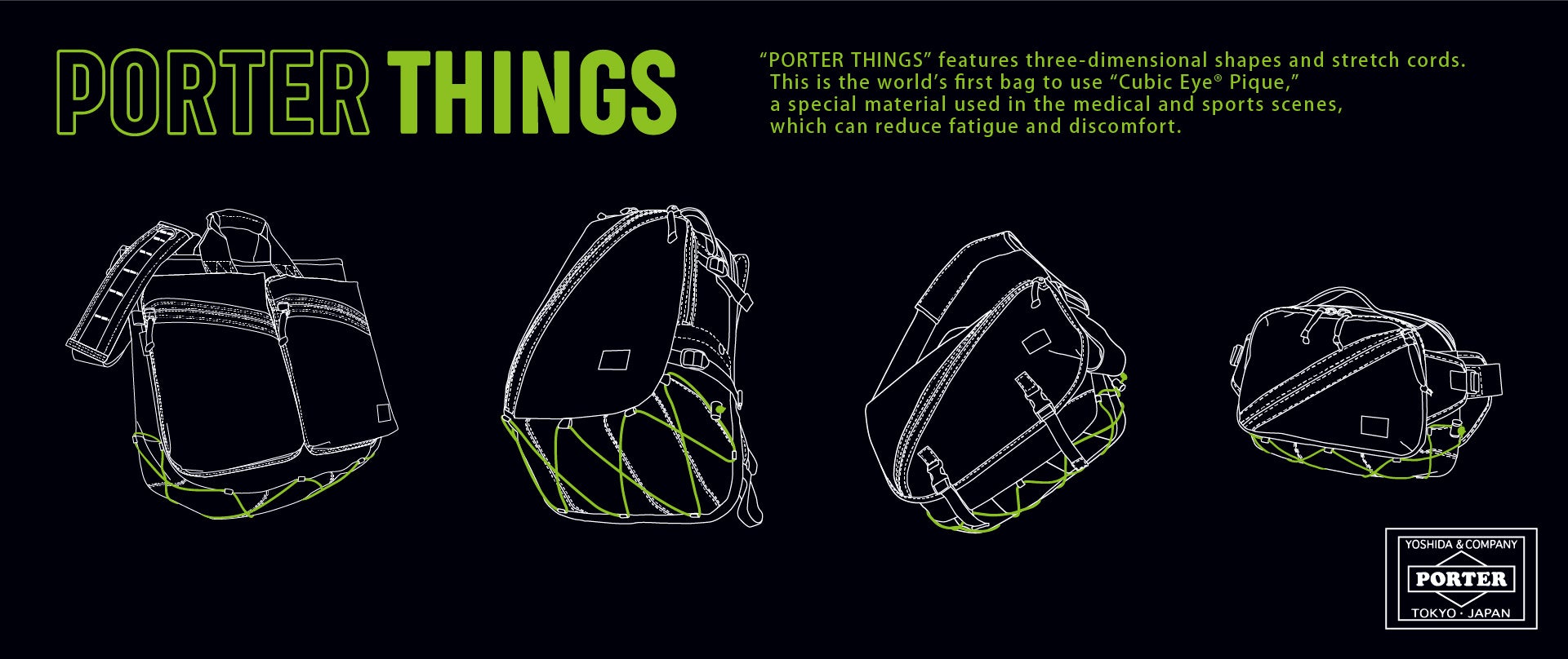 「PORTER THINGS」はストレッチコードとバイアスに取り付けたファスナー、立体的なフォルムが特徴のシリーズです。