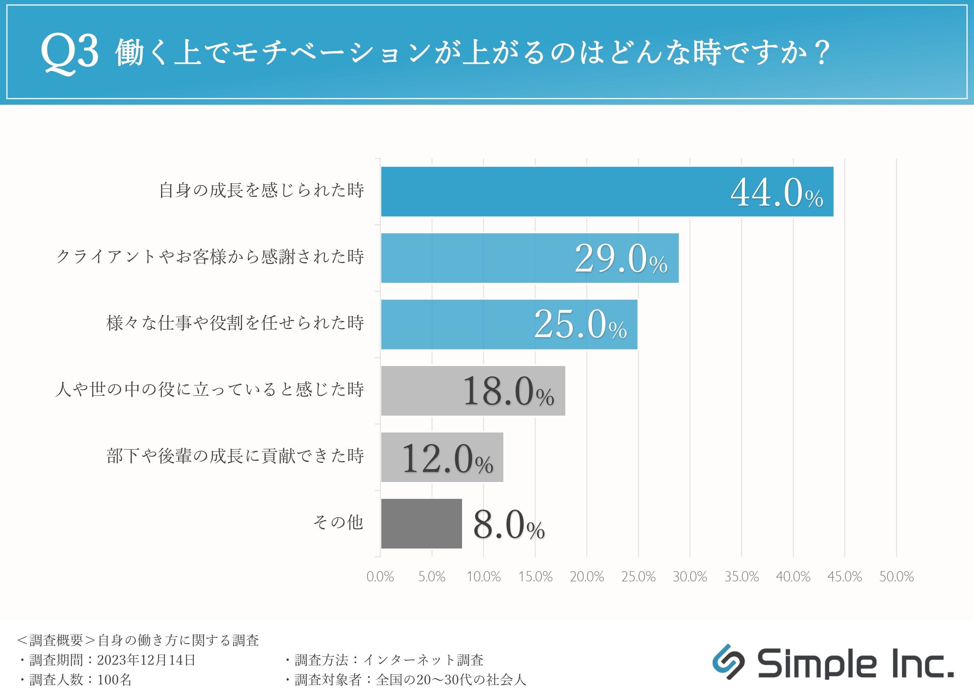 次に、働く上でモチベーションが上がるのはどんな時か伺ったところ、「自身の成長を感じられた時(44.0%)」「クライアントやお客様から感謝された時(29.0%)」「様々な仕事や役割を任せられた時(25.0%)」という回答が集まりました。