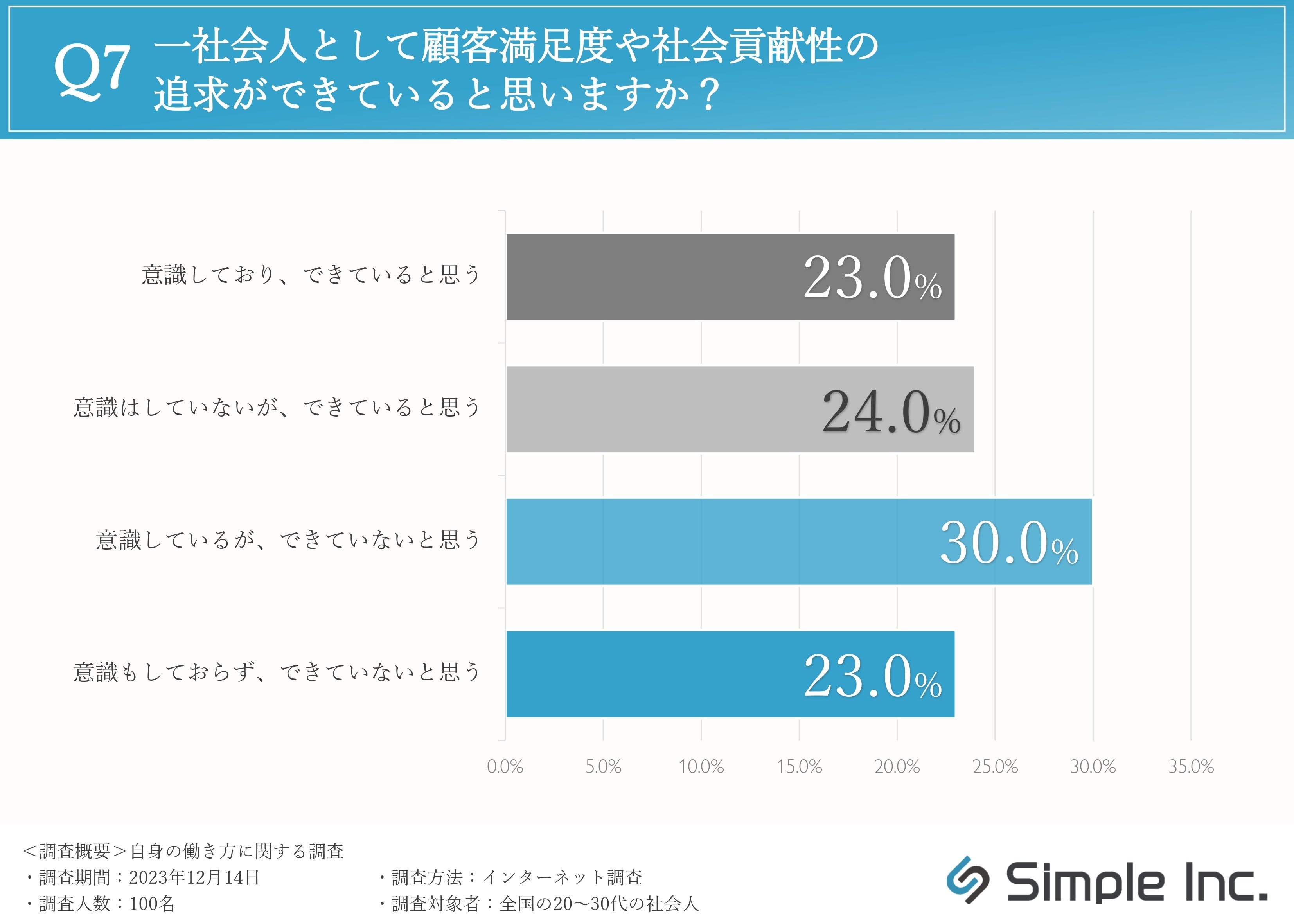 次に、一社会人として顧客満足度や社会貢献性の追求ができているか伺ったところ、「意識しているが、できていないと思う(30.0%)」「意識もしておらず、できていないと思う(23.0%)」という回答が半数以上を占める結果となりました。