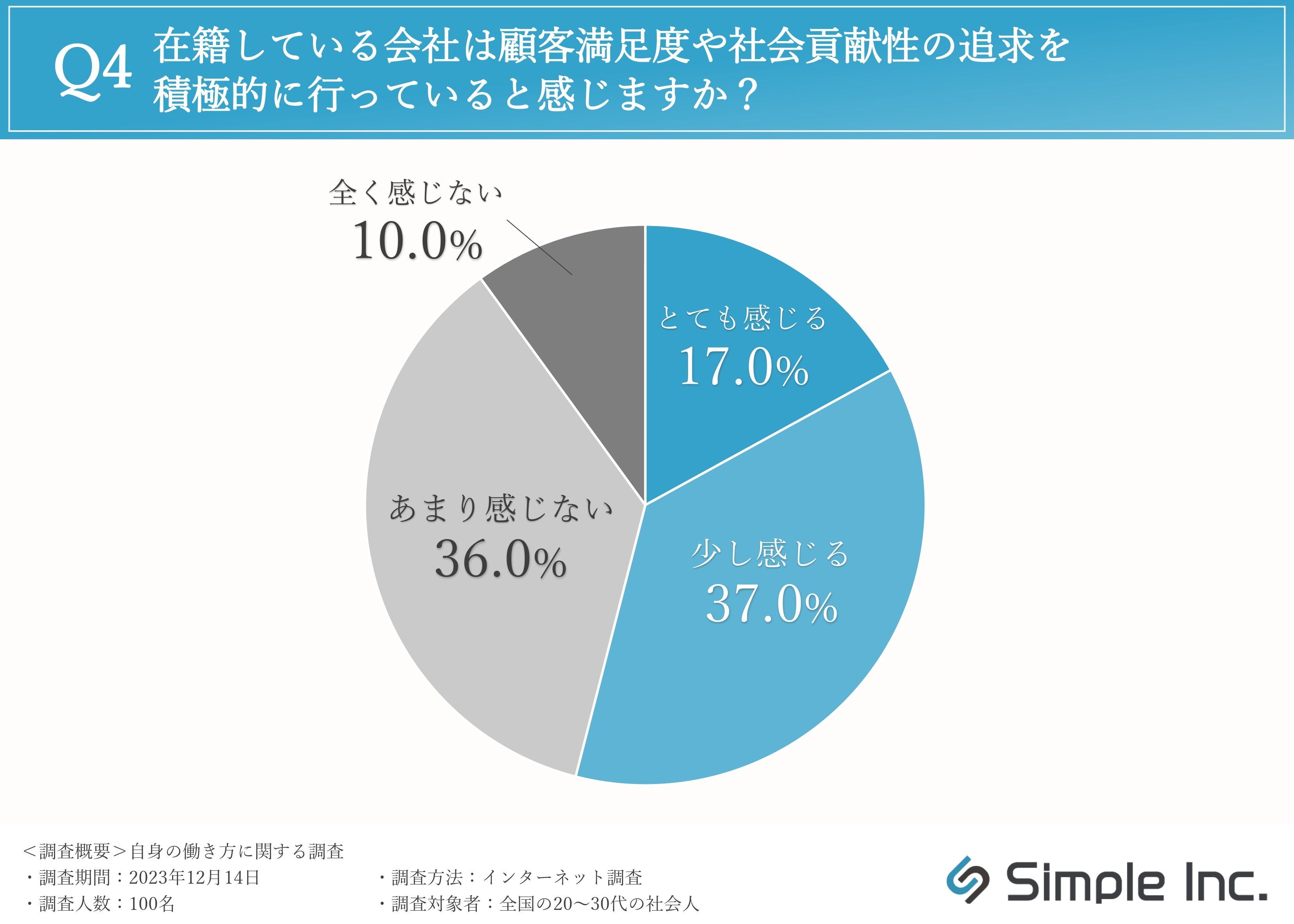 そこで、在籍している会社は顧客満足度や社会貢献性の追求を積極的に行っていると感じるか伺ったところ、「少し感じる(37.0%)」「とても感じる(17.0%)」といった回答が集まり、実に半数以上の方は感じていることが判明しました。