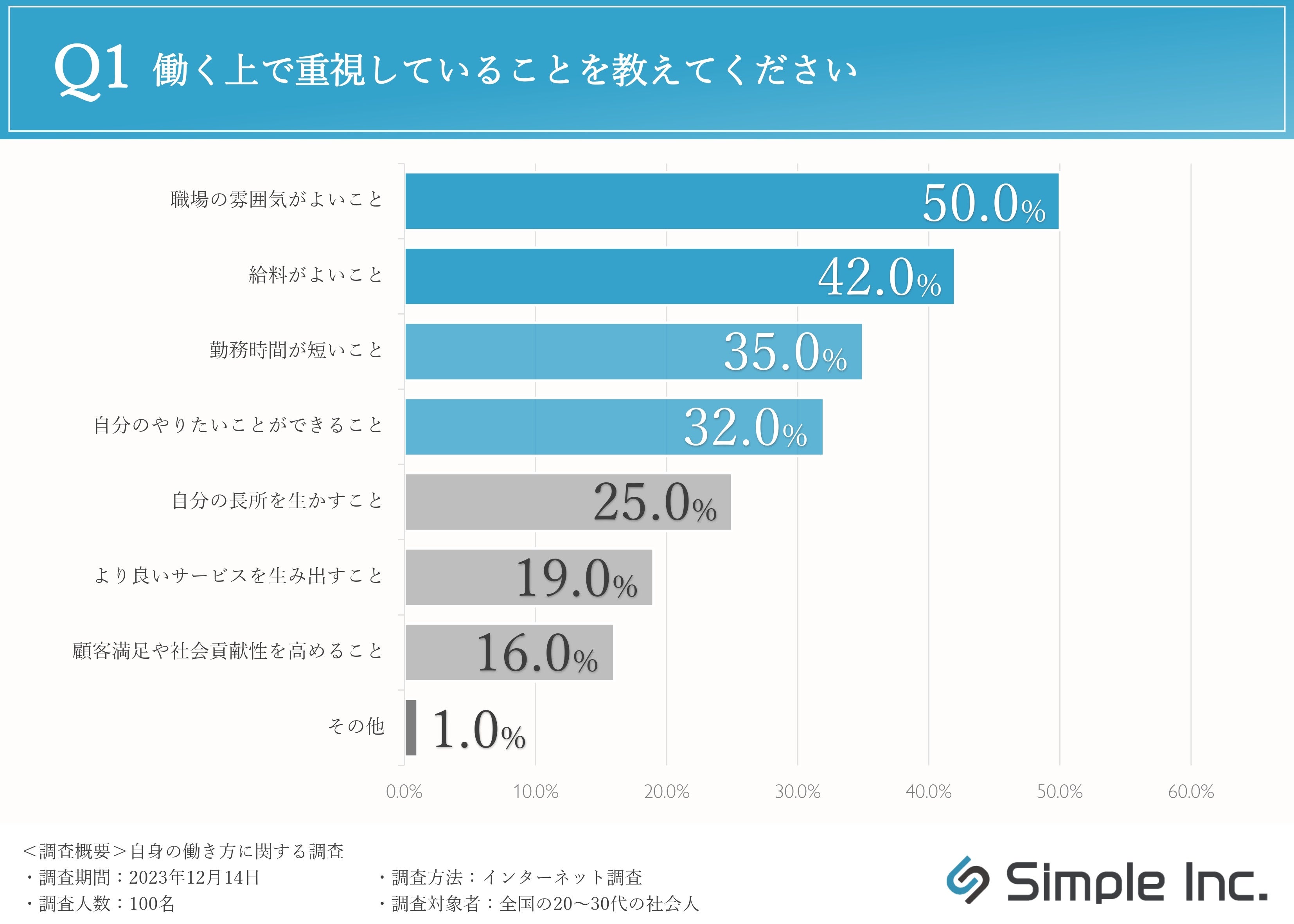 はじめに、働く上で重視していることを伺ったところ、「職場の雰囲気がよいこと(50.0%)」「給料がよいこと(42.0%)」「勤務時間が短いこと(35.0%)」という意見が集まりました。