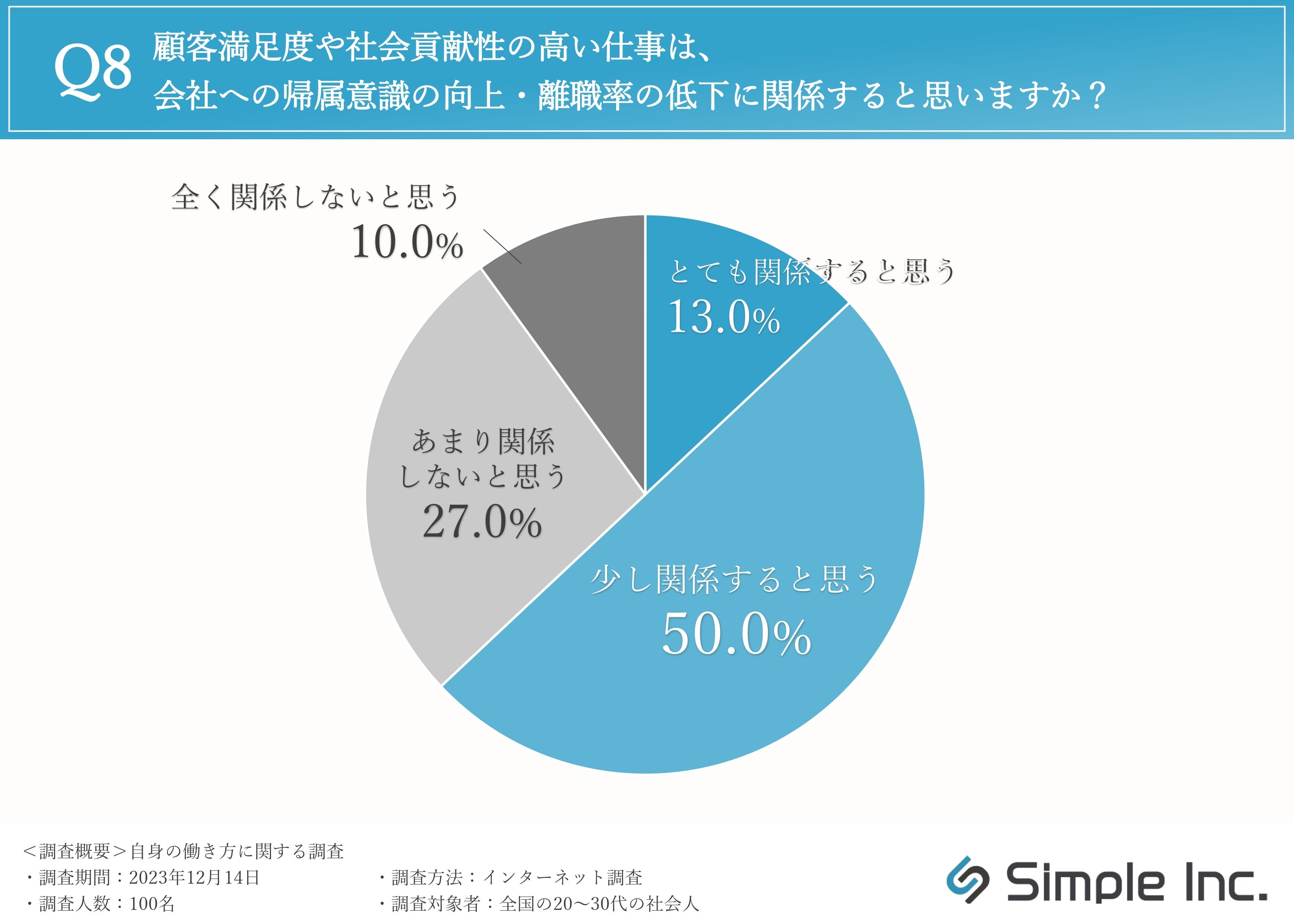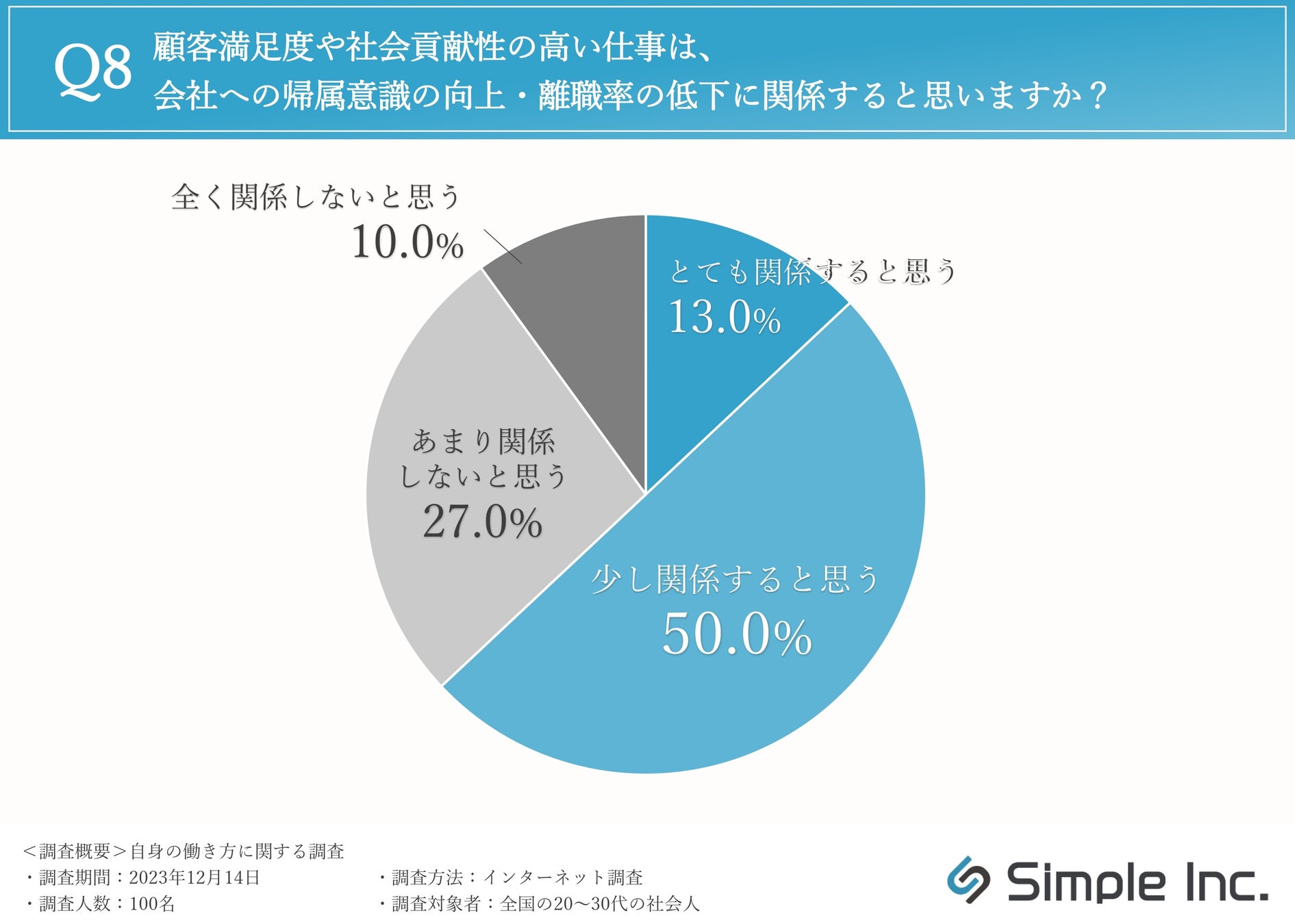 最後に、顧客満足度や社会貢献性の高い仕事は、会社への帰属意識の向上・離職率の低下に関係すると思うか伺ったところ、「少し関係すると思う(50.0%)」「とても関係すると思う(13.0%)」といった回答が集まりました。