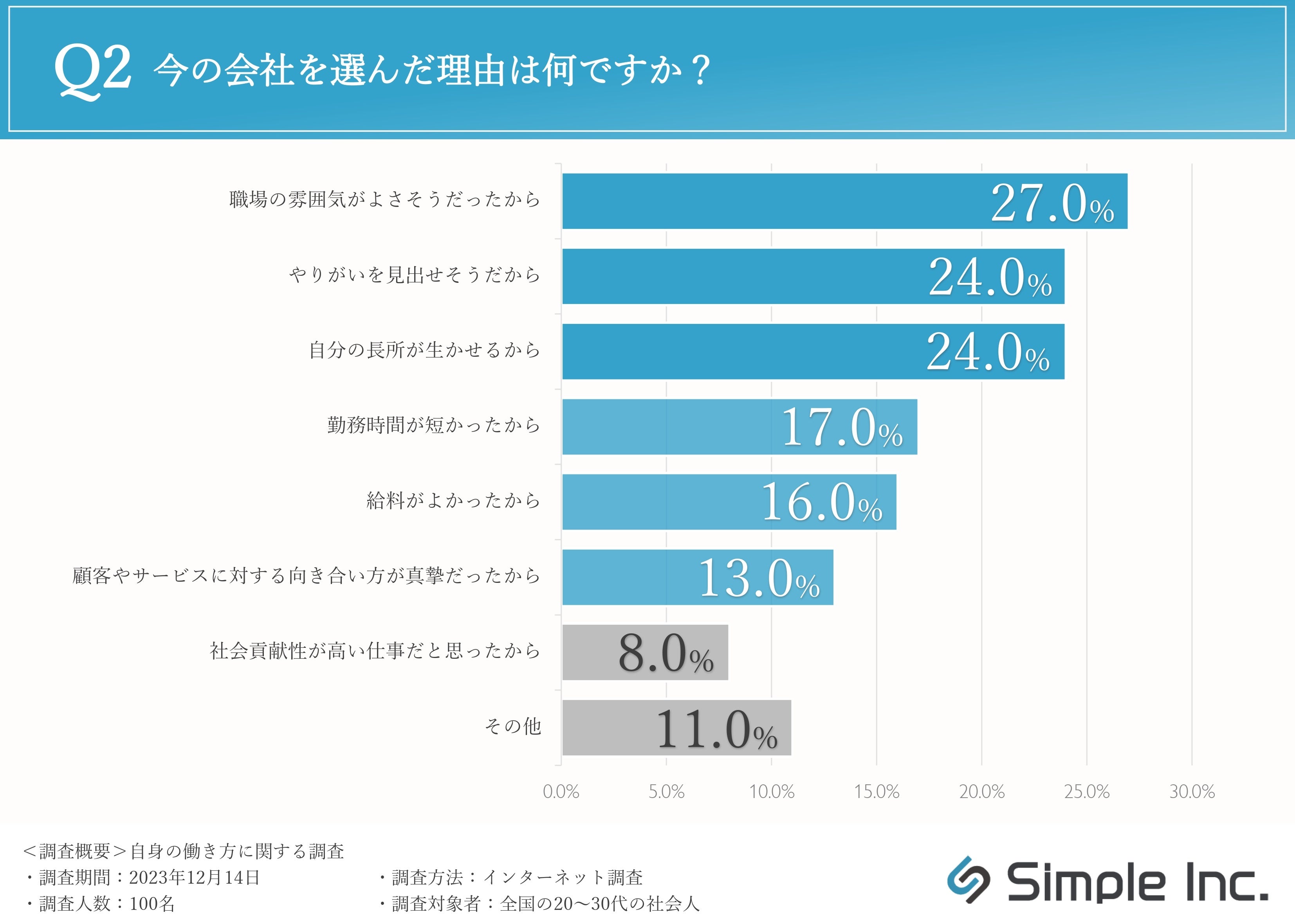そこで、今の会社を選んだ理由を伺ったところ、やはり「職場の雰囲気がよさそうだったから(27.0%)」という意見が最も多い結果となりました。