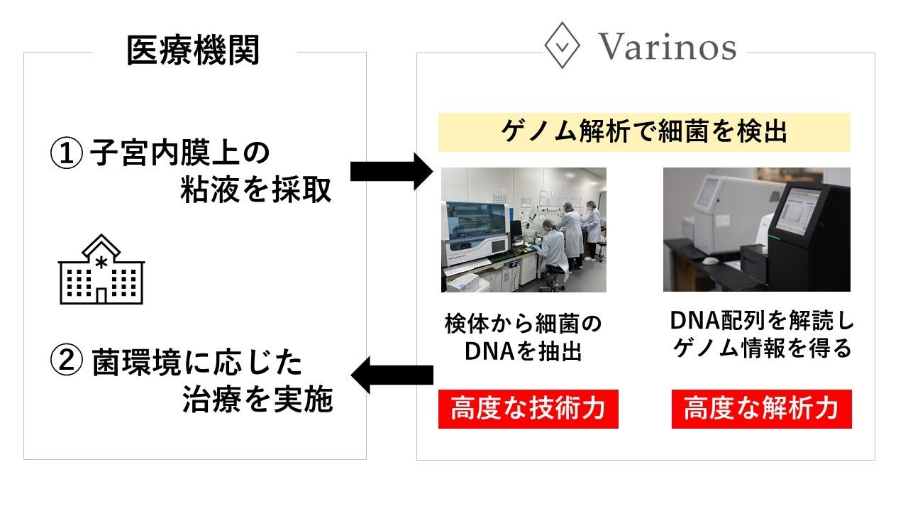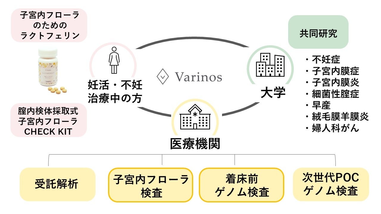Varinosは、高度なゲノム解析だけではなく、ゲノム技術を活用した検査の開発もできる数少ない日本企業です。世界で初めて子宮内の超微量な菌を検出する「子宮内フローラ検査」を独自開発・臨床検査として実用化するなど、現在は不妊治療領域においてゲノムテクノロジーを応用した事業を展開しています。特に主力事業である「子宮内フローラ検査」は、子宮内の菌環境が妊娠率に影響するとわかっていることから、国内の不妊治療クリニックを中心に250以上の医療機関で導入が進んでいます。