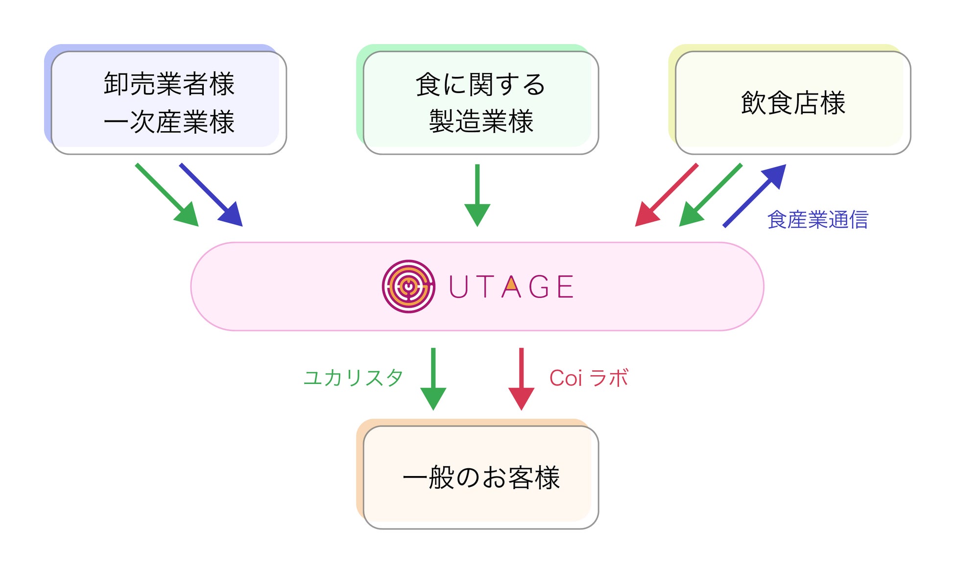 一次産業様や卸売業者様など食産業の上流に関わる企業様が『UTAGE』のお客様となり、飲食店様に情報をお届けします。
