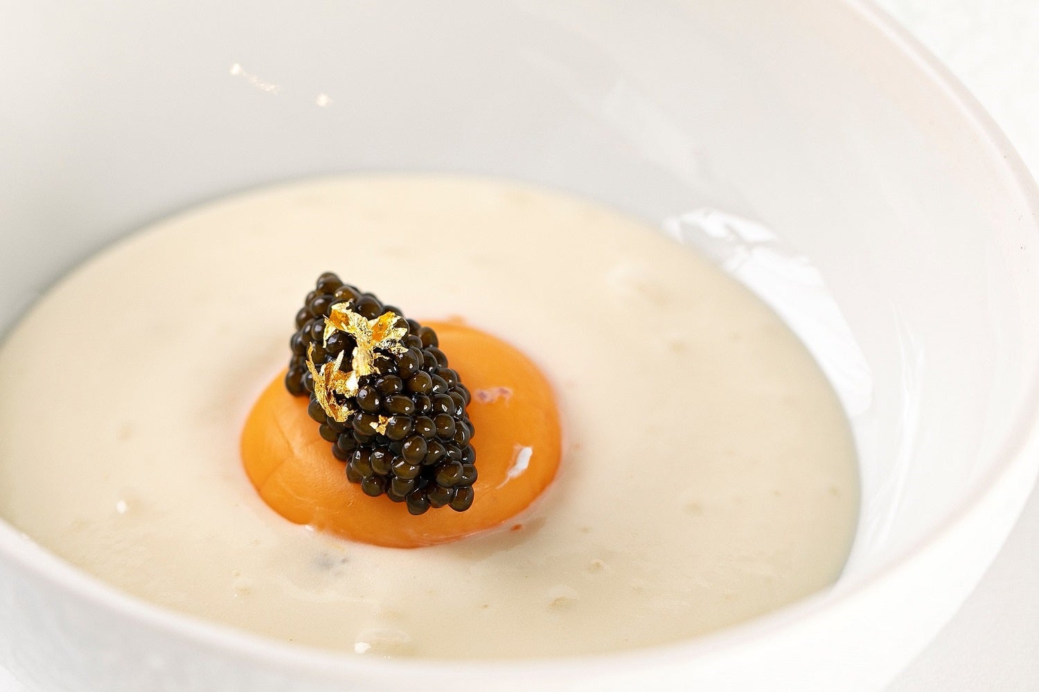 「京都大原 山田農園 オーガニック “野たまご” パルミジャーノエスプーマと白トリュフ」paired with 津軽産ピノ・ノワールスパークリングロゼ2017* *りんごの名産地である津軽。ここで育つブドウにはりんごのような甘さと酸のニュアンスが感じられ、爽やかでゆったりとした果実感をつくりだします。これは、シャンパーニュ的な緊張感のある酸とは違った、日本らしいニュアンス。日本のワインの新しい味をご堪能ください。