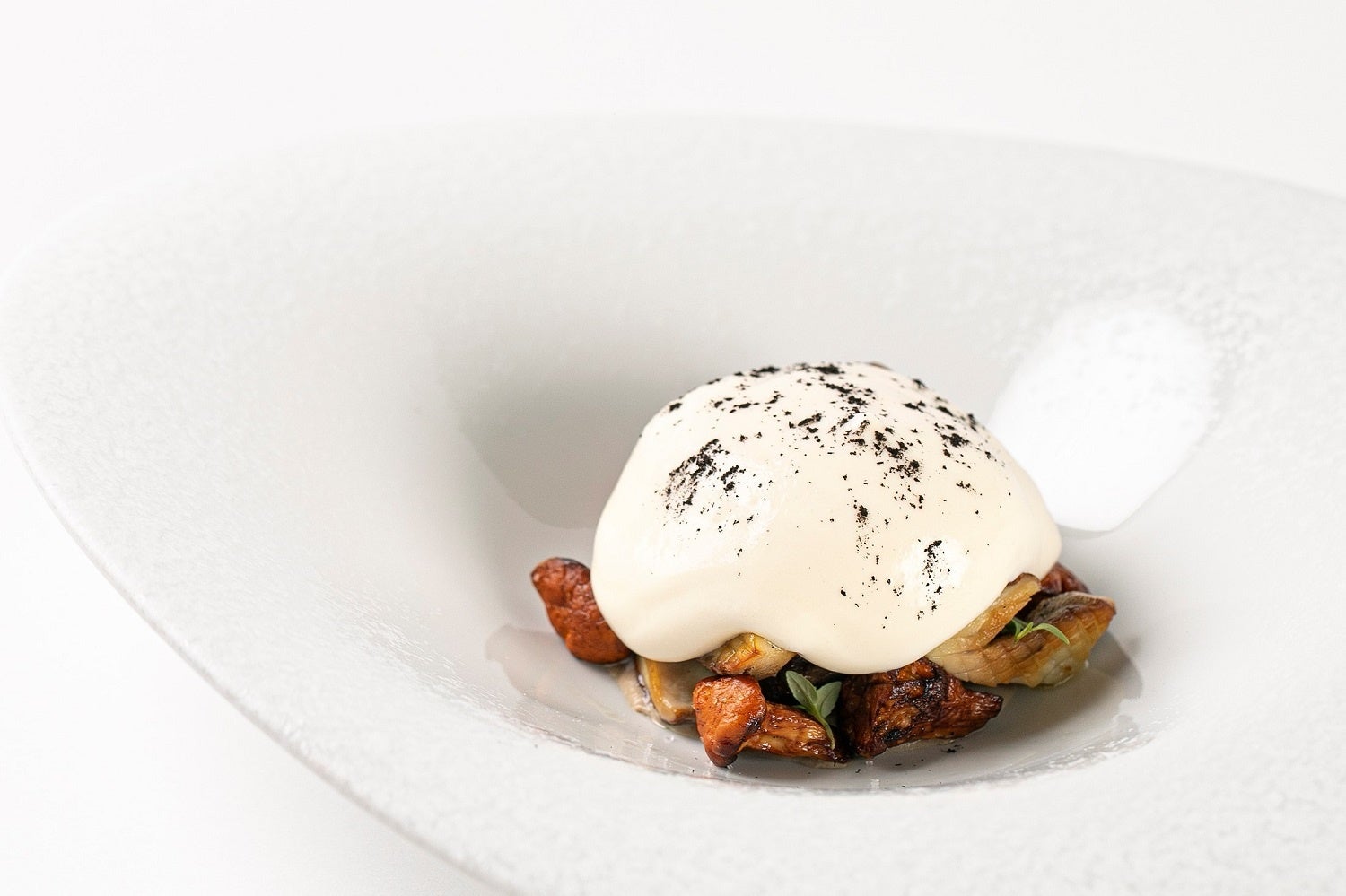 「牛ほほ肉 燻製ジャガイモエスプーマ 丹波しめじと大黒しめじのバリエーション」paired with 塩尻 マスカット・ベリーA ミズナラ樽熟成 / 塩尻ワイナリー