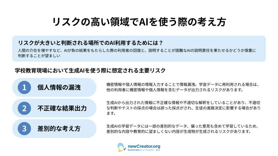 近年、教育業界でも注目されており、教材の制作をはじめ、定型業務の効率化や生徒の学習サポートなどといった幅広い役割が期待されています。その反面、個人情報・機密情報の取扱いや誤った出力・ハルシネーションによる情報収集におけるリスクなどが課題となっており、適切なガイドラインやルールのもとで活用することが求められています。