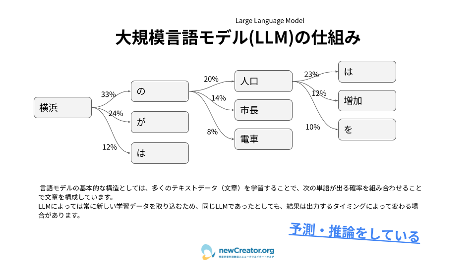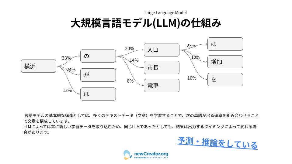 生成AI(Generative AI)は、ユーザーの入力に基づいて新しい文章、画像、音楽などの出力を「生成」するAIの一種です。