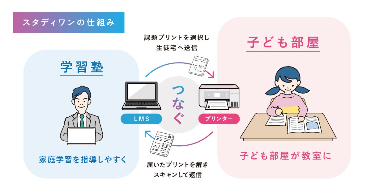 「StudyOne」は、スタディラボが持つLMS(学習管理システム:Learning Management System)と、エプソンが持つ遠隔印刷・スキャン技術を組み合わせて、デジタルと紙を融合させた家庭学習をデザインできるサービスです。遠隔印刷・スキャンを通じ子ども部屋と学習塾をつなぎ、紙教材の課題提出までのやりとりをLMSによって記録することで、先生が生徒の学習過程全体を把握でき、生徒一人一人に合わせた学習指導を行う環境を提供します。