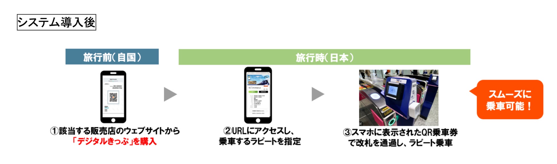 今回のサービス導入により、インバウンド旅客は従来の「南海デジタルきっぷ」公式サイトに加え、海外OTA(※2)からも「デジタルきっぷ」を購入できるようになるため、インバウンド旅客が「駅窓口に立ち寄ることなく座席を指定し、南海電鉄をよりスムーズに利用する」ことができるようになります。