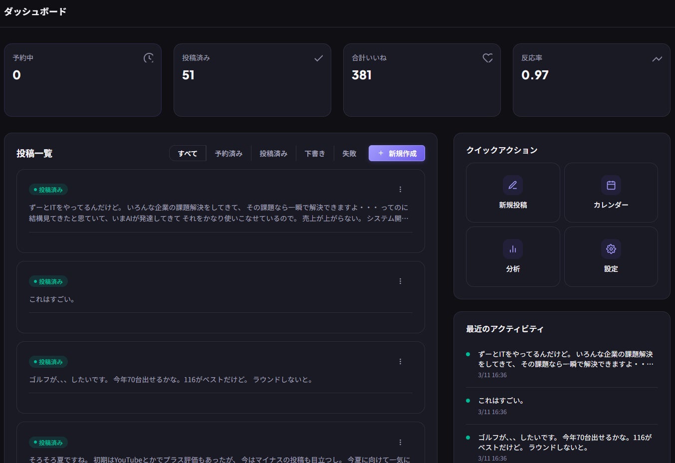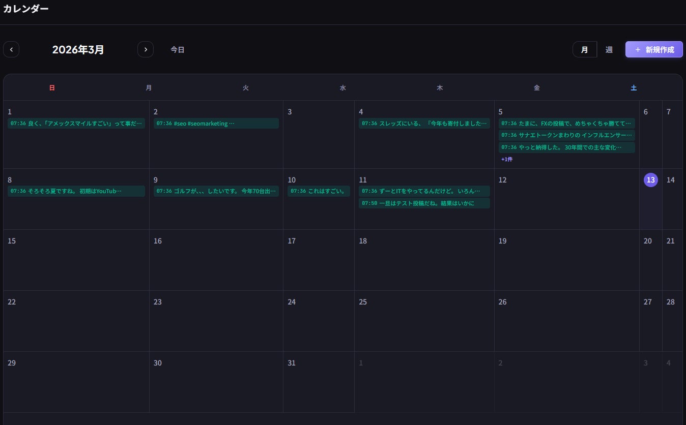 投稿一覧から、予約済み、投稿済み、下書き、失敗などのステータスを確認でき、運用状況を把握しやすくします。