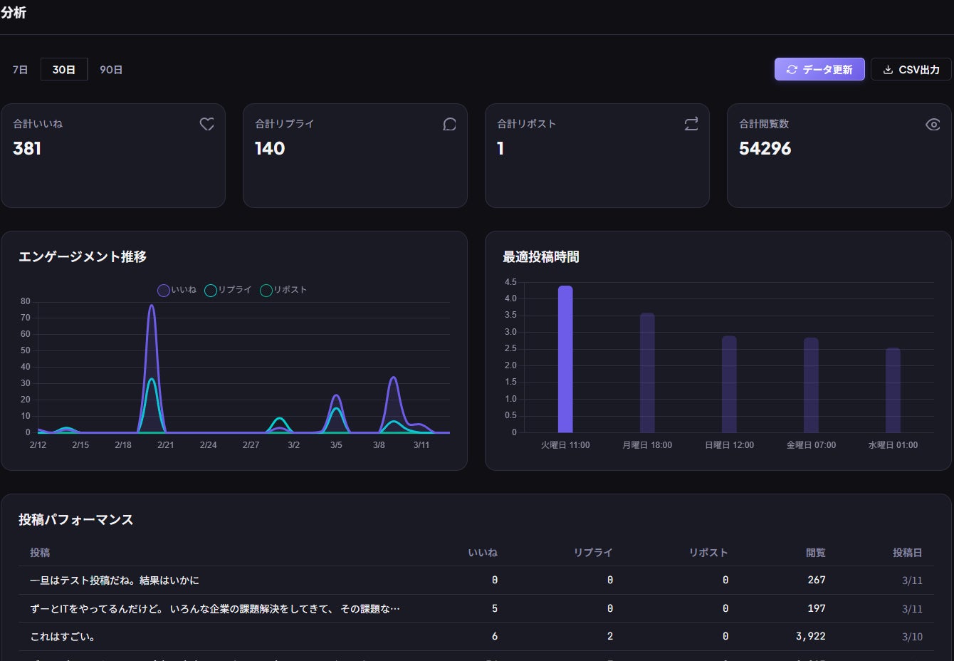 投稿数、いいね数、反応率などの指標を確認でき、運用改善に役立てることができます。