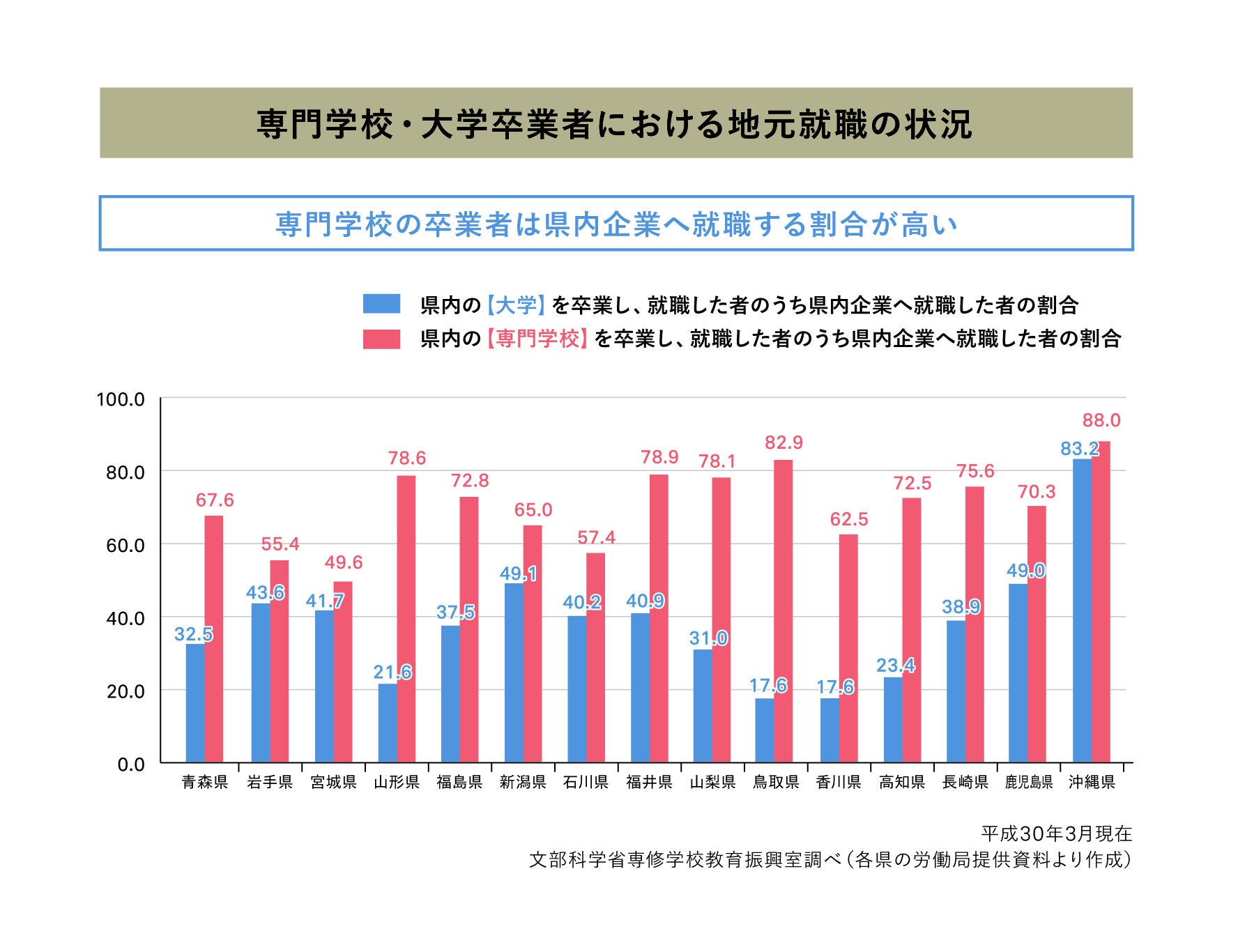 例えば、あまり知られていない事実として、専門学校と大学卒業者の地元就職の状況を調査したデータによると、専門学校の卒業生は地元で就職している割合が高い傾向にあります。
