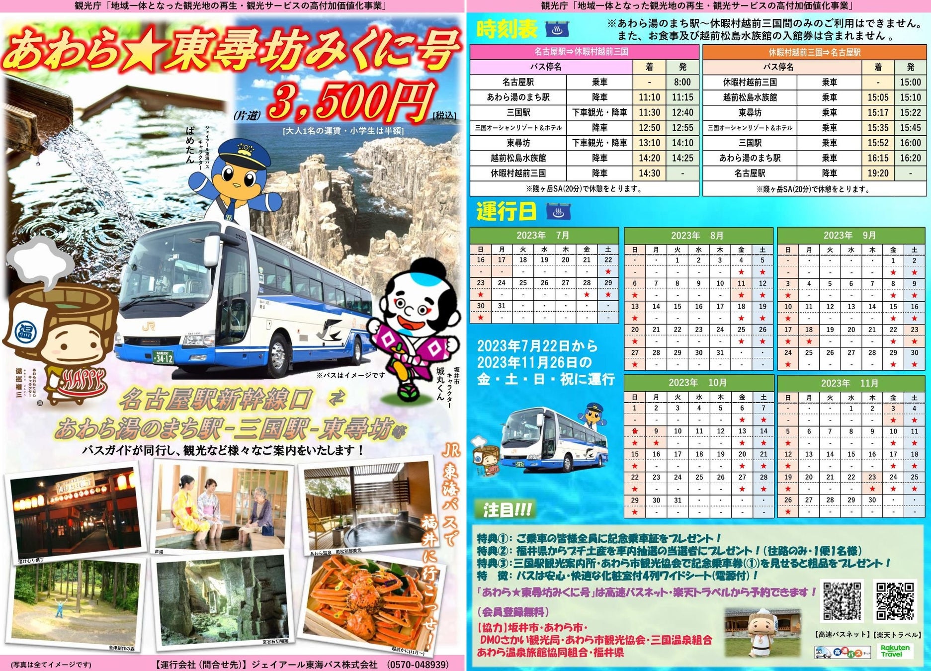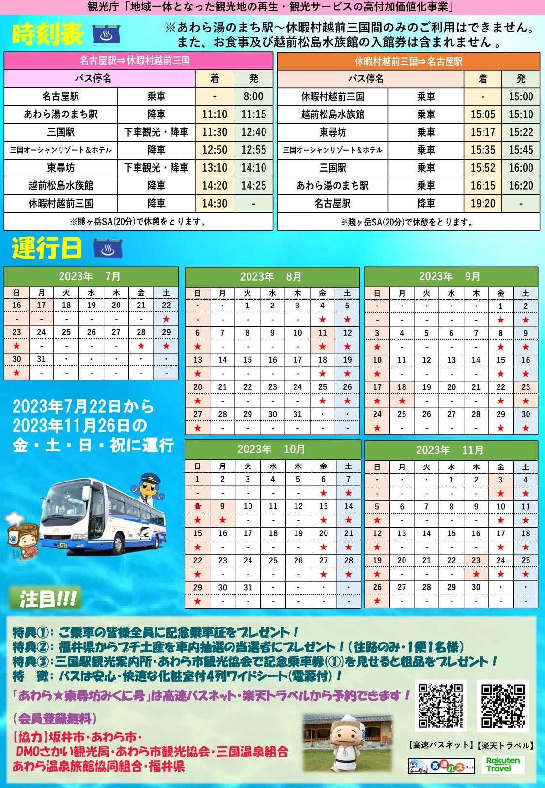 「あわら★東尋坊みくに号」は、名古屋方面からあわら市・坂井市に乗り換えなしで安価に利用できます。