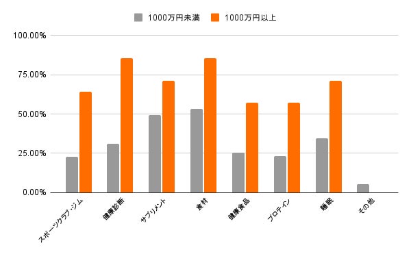 世帯年収1000万円以上の層は「プロテイン」「ジム」「健康診断」に投資する人が2倍以上