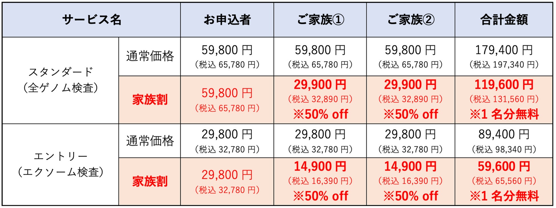 ゲノム検査サービス スタンダードおよびエントリーのお申し込みに際して、ご家族2人目、3人目の検査料金が通常金額の半額になるサービスです。