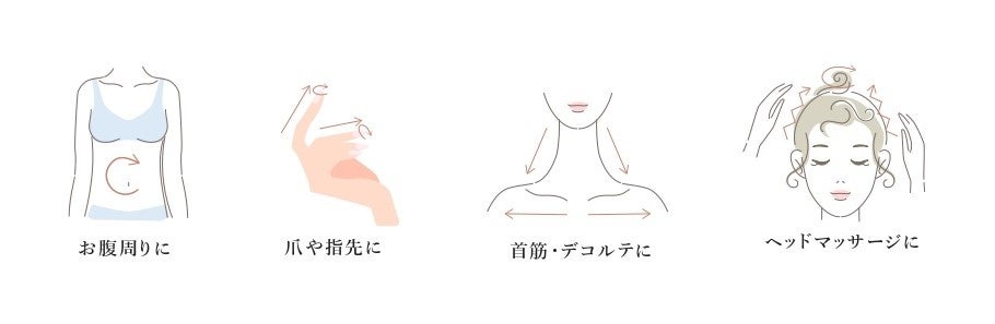指先や手元、首筋やデコルテ、お腹周りなどに塗り、アロマトリートメントやパフュームとして、あなただけのアロマテラピーをお楽しみいただけます。容器を肌に垂直に当て、強く押し当てずにやさしくローラーを転がしてご使用ください。マッサージするように塗るのがおすすめです。